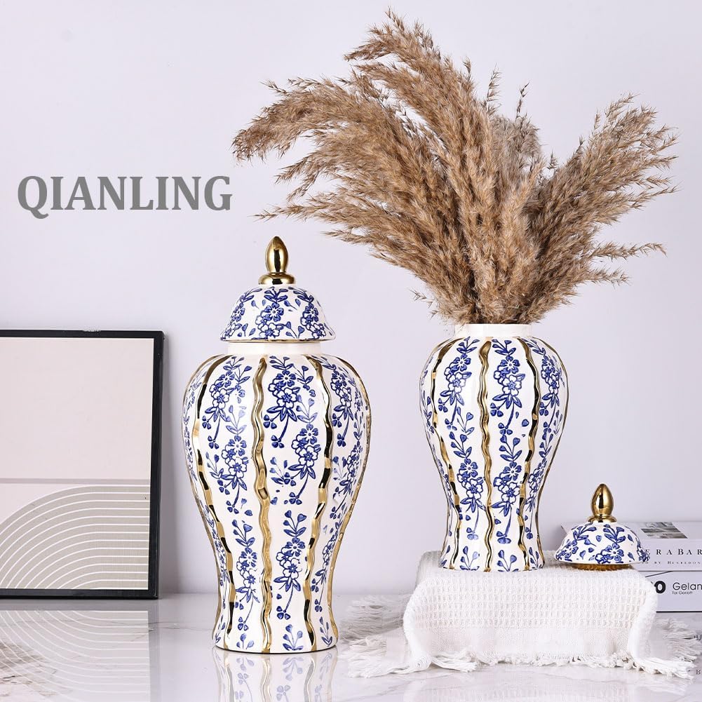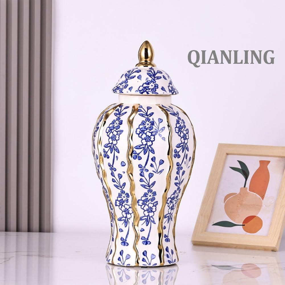 Exquisite Design and Elegant Appearance: This white and gold ginger jar combines delicate blue floral patterns with gold edges, creating a noble and elegant look. Perfect as home decor, it enhances any room, whether in the living room, study, or bedroom, adding a touch of unique charm to your space.High-Quality Ceramic Material: Made from premium ceramic, this ginger jar is durable and long-lasting. The ceramic material offers excellent heat preservation and corrosion resistance, ideal for storing dry goods or spices. Its smooth surface is easy to clean and maintains its aesthetic appeal over time.Large Capacity and Versatile Use: With dimensions of 8.66 inches (L) x 8.66 inches (W) x 18.1 inches (H), this jar offers ample storage space, perfect for tea leaves, coffee beans, or candies. American consumers love using it for both storage and decoration. Removing the lid, it transforms into a beautiful vase for flowers.Versatile Usage Scenarios: This ginger jar is perfect for various home settings, such as the kitchen, fireplace mantel, dining table, living room, entryway, and hallway. Its dual function as a storage jar and a decorative vase makes it a versatile addition to any decor style.