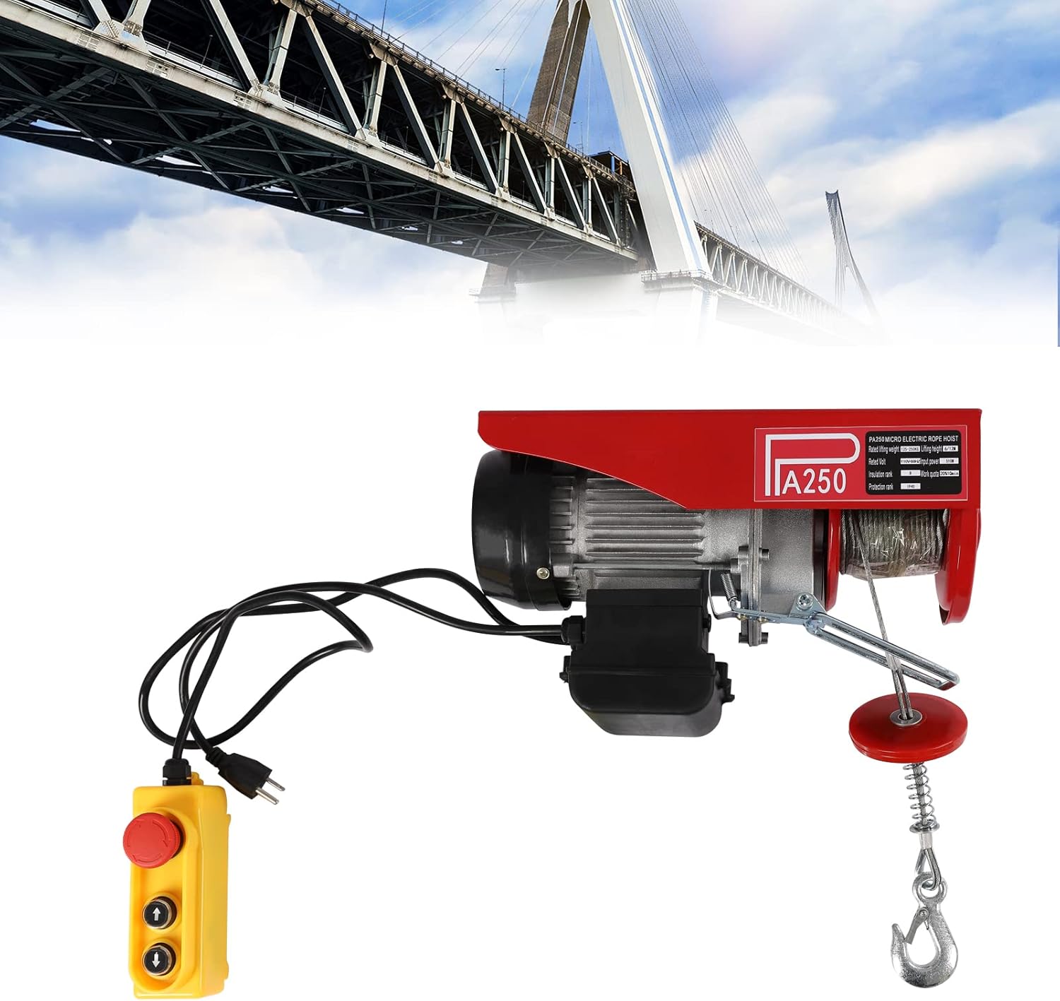 Description There are problems at work where things are so heavy that it is very difficult to move them purely by hand. The development of modern technology has brought great convenience to mankind, both in life and at work. The powerful motor and the sturdy wire rope provide a powerful lifting capacity and high work efficiency. It will be a great assistant for your lifting work!DetailsWired Remote Controller: It is equipped with a long wired remote control, which allows you to control the lifting and lowering functions of the electric hoist from a safe distance. Also, the red button on it allows for an emergency stop of the equipment to prevent sudden accidents.Pure Copper Motor: It adopts a high-powered pure copper motor(510W), with good heat dissipation and stability, providing strong power for lifting. In addition, it operates at low noise, giving you a more comfortable working environment.Practical Lifting Straps:The package is equipped with two additional lifting straps for securing hard-to-hook goods, so you don't need to buy extra, which is economical and convenient. ApplicationThe electric hoist is suitable for factories, docks, warehouses, logistics, construction sites, car manufacturers, railways, construction, garages, ceilings, attics, barns, lofts, etc. for lifting regular or irregularly shaped objects. The electric hoist can be used for various lifting equipment, such as single column, wall column, crane, etc.SpecificationsHousing Material: Carbon SteelFinish: Plastic SprayHook Material: Galvanised Alloy SteelCable Material: Galvanised Carbon SteelMotor Housing Material: AluminumMotor Type: Pure Copper MotorColor: RedModel: PA250Plug Type: US Standard Voltage: 110V-60HzPower: 510WInsulation Rank: BProtection Rank: IP40Load Capacity: 125kg/275lbs(Single Cable), 250kg/551lbs(Double Cable)Lifting Speed: 32.8ft/min (Single Cable) , 16.4ft/min (Double Cable)Lifting Height: 12m/39.4ft(Single Cable), 6 m/20 ft(Double Cable)Work Quota: 20%10minProduct Size: 35*10*12cm/13.7*4*4.7inLarge Hook Length: 11.5cm/4.5inSmall Hook Length: 10cm/4inPacking Size: 38*16*27cm/14.96*6.29*10.62inGross Weight: 10kg/3.93lbsPackage Included1 * Electric Hoist2 * Lifting Straps1 * Hook2 *Mounting Clamp Brackets1* Wired Remote Control1* English ManualAll Accessories for UseNotes1. Please note that the width and height of the boom should not exceed the internal dimensions of the mounting bracket.2. If the specified object is too large or the object cannot be hung directly on the hook, you will need to tie a longer webbing around the object and then hook the webbing with the hook to lift the object.3. Please ensure that all persons in the immediate area are informed and warned of the need for safety before lifting and moving heavy objects. If necessary, set up a lifting area to remind unoccupied and uninvolved persons that they are not allowed in.4. Please purchase the electric hoist corresponding to the weight required for the job.5. If the hook is cracked or deformed, or if the wire rope is kinked or corroded, please do not use the product.6. Please do not leave lifted heavy objects unsupervised for long periods as this may cause injury.7. Before using the machine, please read carefully all the safety instructions in the product manual.8. Please allow the slight color difference caused by the shooting light and 1-3cm error due to manual measurement, and make sure you do not mind before you order.
