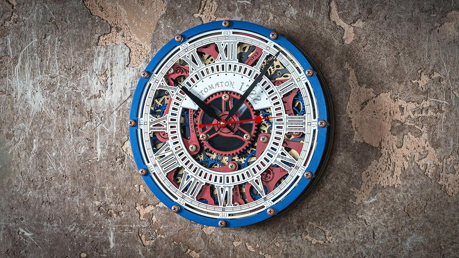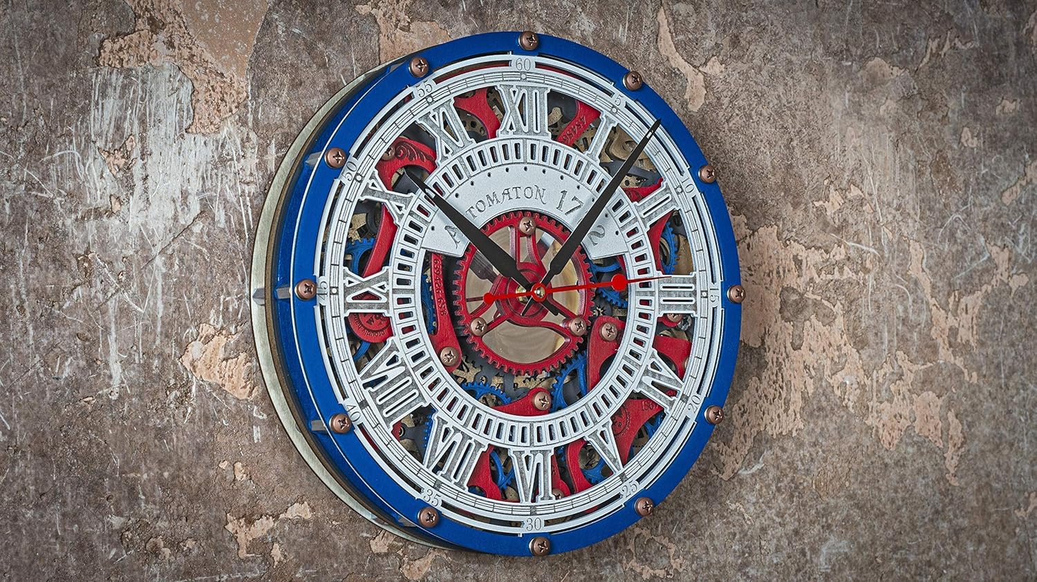 We created the Automaton Wall Clock series getting inspired not only by old mechanical wrist watches which gear motors seem to us real works of art but mechanical toys which were quite popular among the rich in XVIII in France.This wall clock belongs to our new Automaton Bite Wall Clock series but the main difference is that here all the gears move smoothly and silently together with the clock mechanism. This beautiful effect of motion doubles because of the mirror back layer. The gears are powered by 4 AA batteries. Moreover this Automaton wall clock is much bigger than the other ones.An automaton (pronunciation: /ɔːˈtɒmətən/)(plural: automata or automatons) is a self-operating machine, or a machine or control mechanism designed to follow automatically a predetermined sequence of operations, or respond to predetermined instructions. Some automata, such as bell strikers in mechanical clocks, are designed to give the illusion to the casual observer that they are operating under their own power. (c) wiki Our wooden clock is made of many layers of Baltic birch, painted wood stain and acrylics. Handcrafted galvanized brass screws are used in the clock.*the clock can be personalized (any name on clock face instead `Automaton` ). Size : 315 mm (12.4 in) *AA battery is not included **the clock hands can slightly differ from those on the pics