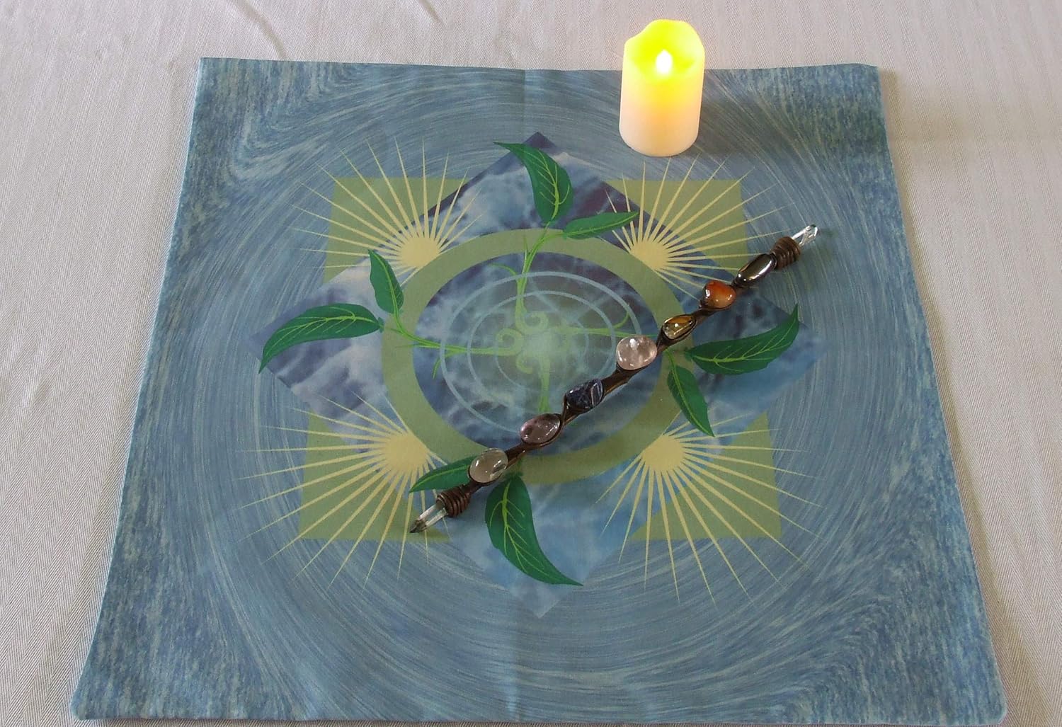 An original design by Artist Wendy Wilson of Magic in Your Living Room This Pagan altar cloth or Wiccan altar cloth celebrates the end of winter. We celebrate the spring equinox - Ostara or Eostre in the Wheel of the year. The warming earth is revealed from the snow. The seedlings unfurl. This design celebrates the amazing cycle of life, renewing itself every spring. The Goddess dances in her garden This beautiful altar cloth is about 18" or 45 cm square. My altar cloths are 2-ply, a high-quality cotton backed by a layer of cotton, for a nice weight on the altar. All altar cloths are available, as a special order, in any size up to about 35" square. Prices scale with size. The altar tools and tarot cards are just for display purposes. All I am selling is the altar cloth.