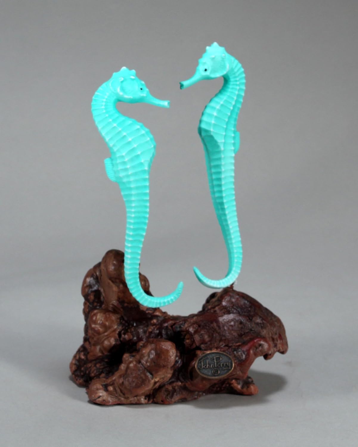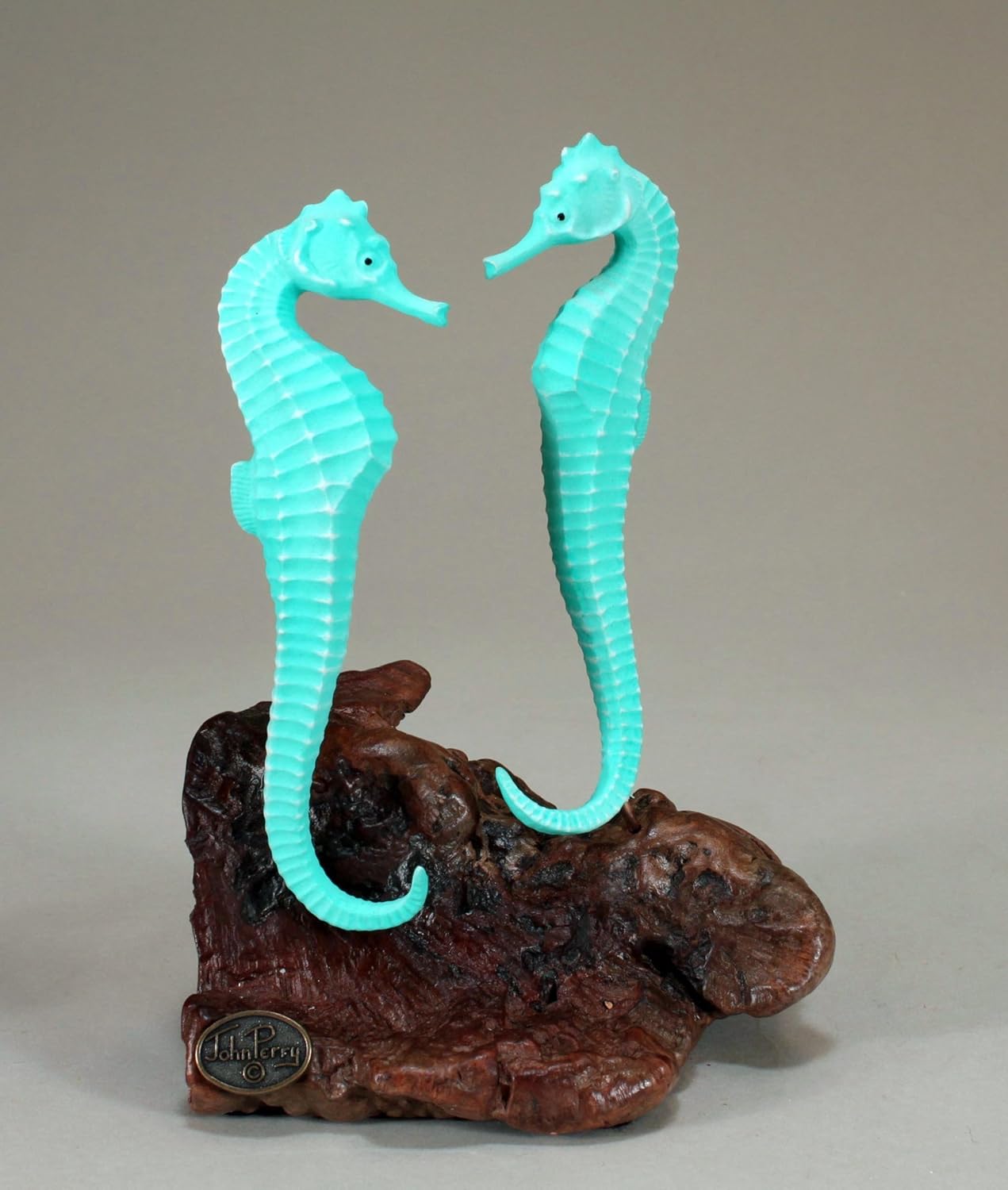 Few fish are as charming and fascinating as the Seahorse. This pair, courting maybe, are molded from Pellucida, our proprietary resin compound that resembles Bisque porcelain, but is more durable. They are then airbrushed. The seahorses are about 6 inches long. Including the polished burlwood base, the whole piece is about 7 inches tall. PLEASE NOTE: these photos are of illustrative samples. Each burl is a unique piece of nature's art, so the one you will receive will be different but of similar size and comparable beauty. It is SIGNED and comes with a CERTIFICATE OF AUTHENTICITY.