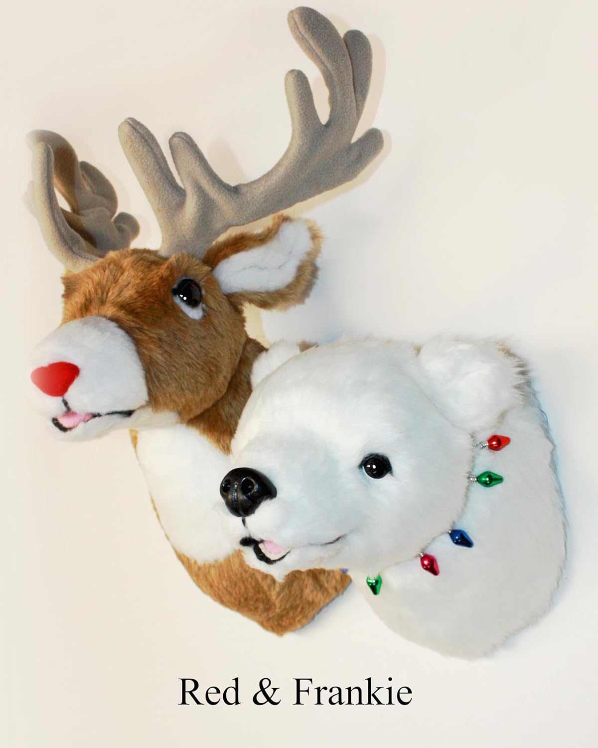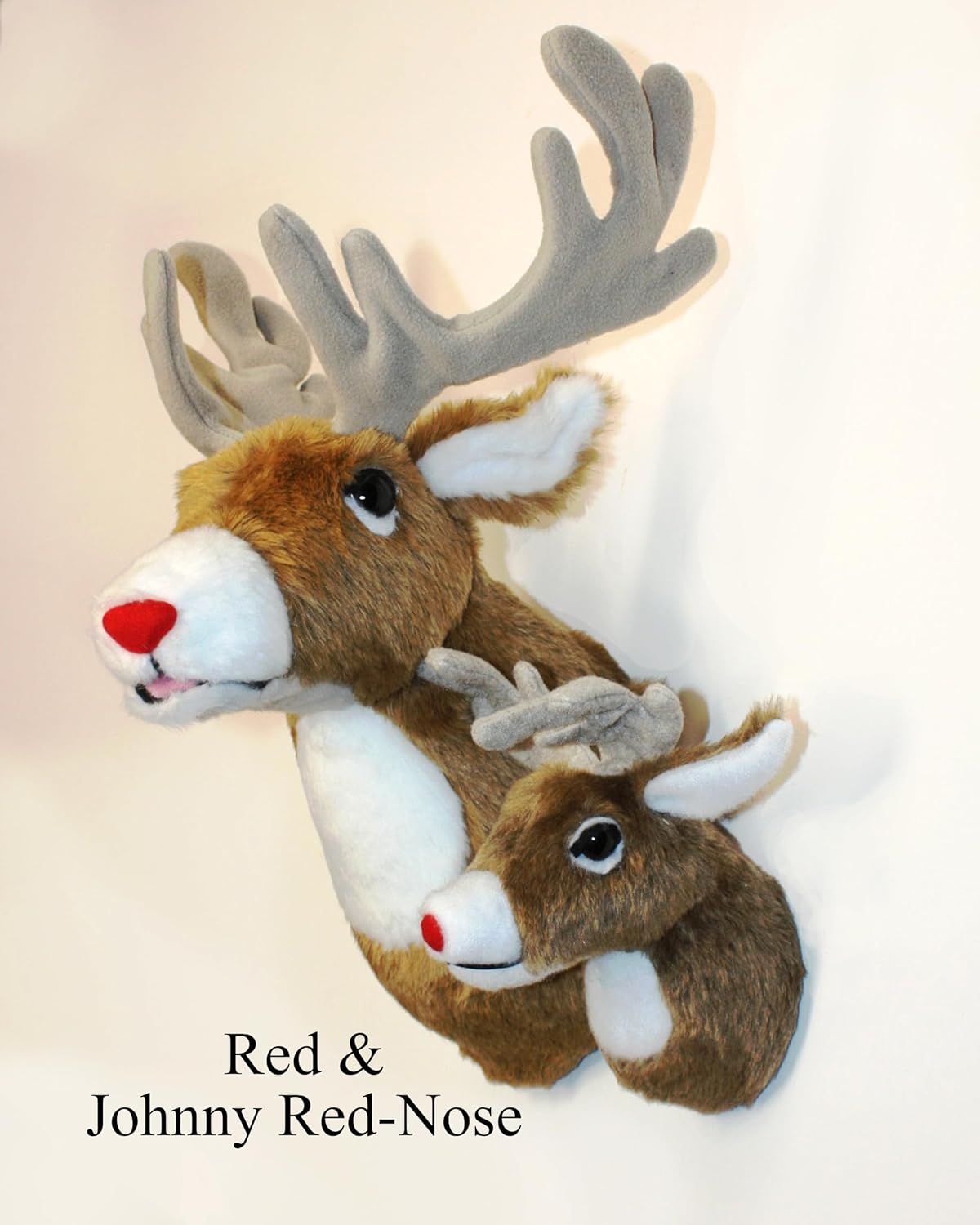 Looking for something different to decorate with? Red can help. DETAILS: Golden tan faux fur. Sleek triangular face. Long neck. 24mm deep brown eyes. Red fabric nose. Fixed mouth. Fully adjustable 10" long antlers. Posed looking left. Almost seamless construction. Firmly stuffed with non-allergenic polyfill. Finished as a shoulder mount. Ready to hang.