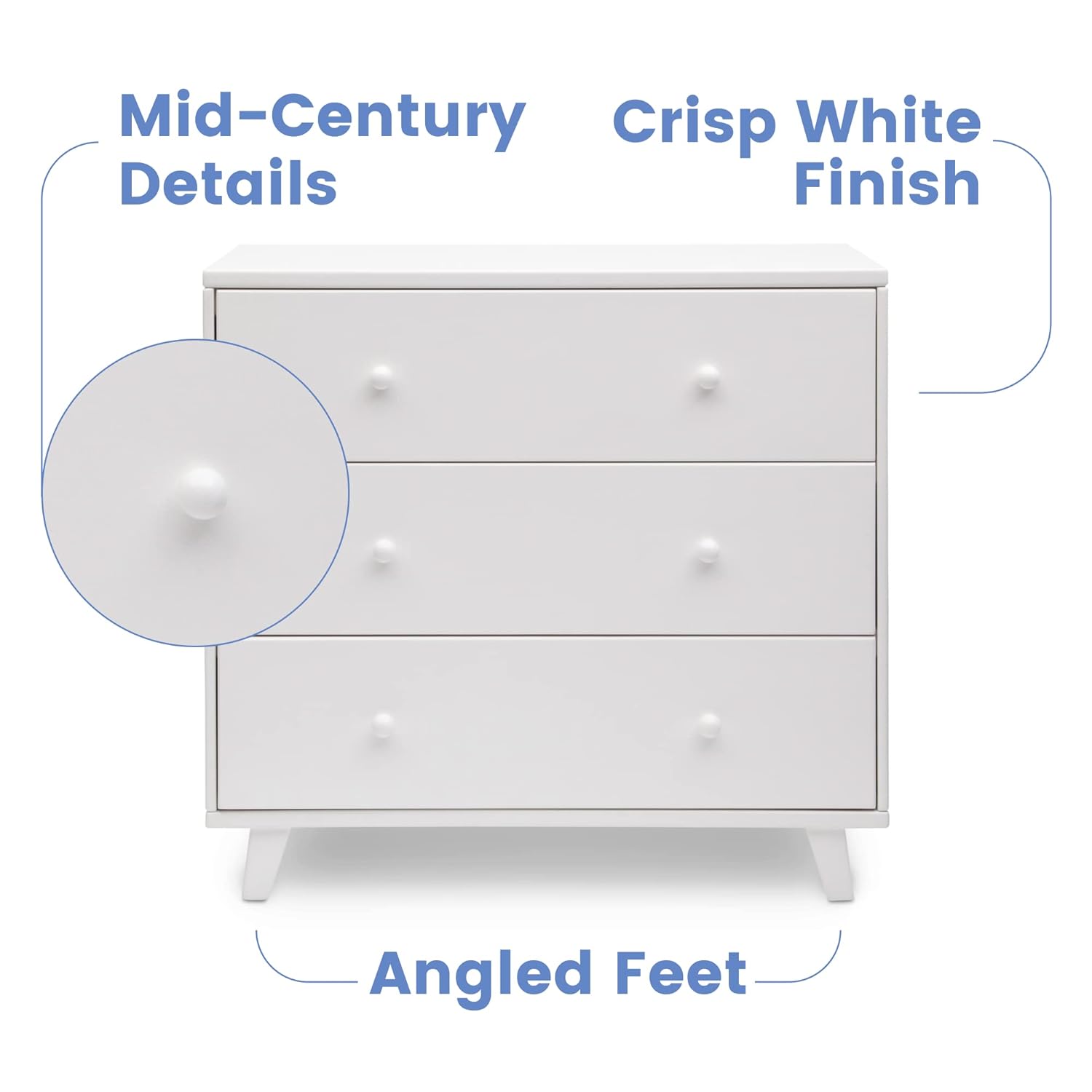 A modern heirloom, the Ava 3 Drawer Dresser with Changing Top from Delta Children features clean, crisp lines and three spacious drawers with plenty of storage for your growing baby. Topped with a removable changing top, the dresser does double duty; so once your baby outgrows the need for a changing table, just detach the top. Plus, its legs match Delta's Ava 3-in-1 Crib, pair them together to create a cohesive nursery, or mix it with existing furniture for a more eclectic look