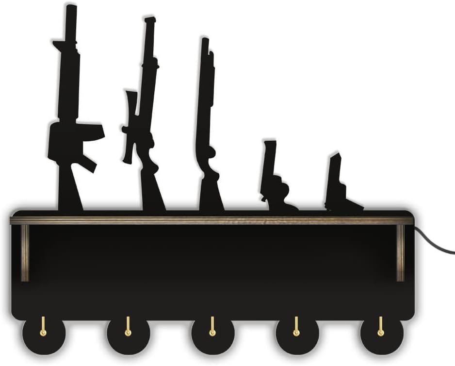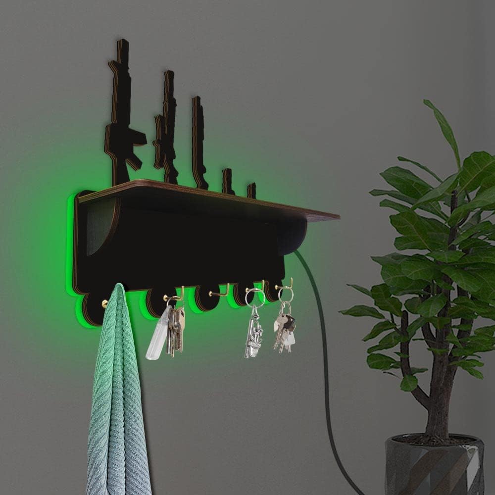 This entryway organizer is a great platform to organize your keys, mail, or anything else you need, as you head out the door, as well as an artistic piece for decor.A rustic style hanger rack display shelf, will not just bring you comfort but it will also fit perfectly to your space. You will have enough space to put your small objects and hang your clothes at the same time.A wall hook with an eye catching LED lighting sign is something just perfect for your wall. Decorating with this magnificent LED lighted wall art will allow you to express your unique style, design, and flair on the walls in your home, ranch, cabin, lodge, or cottage.Feature:Material: Double nature wood +metal hanger+ LED lightSize: 30cm/12inch length, 3.9*12inch wide top shelf, 180cm/70inch USB wire lengthLED Light: 7 color changing LED light include purple, red, yellow, green , white, blue and cyan powered by USB.Its energy efficient LED light has a long lasting lifetime of more than 50,000 hours.Wall Hanging: There are two holes back on the wooden, wide back slot ensures easy installation, hang on any nail, screw or small wall hook.How to Installation:1. You will get wooden pieces*4, gold screw hooks*52. Insert two small black pieces of wooden into rectangular board to finish display shelf, and then insert the display shelf into the gap of other board.3. Rotate the five gold screw hooks mounting into corresponding holes .There are two holes back on wood, wide back slot ensures easy hanging, hanging on any nail.(not included)4. Finished.
