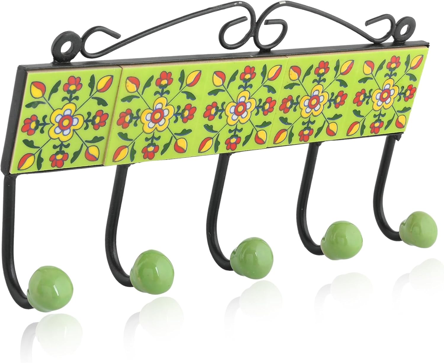 This decorative key holder brings the timeless beauty of blue pottery-inspired artistry to your entryway or hallway. Featuring a stunning green floral design with intricate hand-painted patterns of blooming flowers and delicate vines, this wall-mounted organizer combines functionality with artistic charm. The piece showcases five sturdy hooks, each topped with elegant green ceramic knobs that securely hold keys, leashes, small bags, or other everyday essentials. Measuring 10 inches wide by 6.2 inches tall, this compact yet spacious organizer fits perfectly in any space without overwhelming your decor. The ornate scrollwork metal frame adds a touch of vintage elegance, while the vibrant tile-inspired design serves as a captivating focal point. Each hook is thoughtfully spaced to prevent tangling and provide easy access to your items. Perfect for keeping your entryway organized and clutter-free, this key holder transforms a practical necessity into a beautiful decorative accent that reflects traditional craftsmanship and contemporary utility.