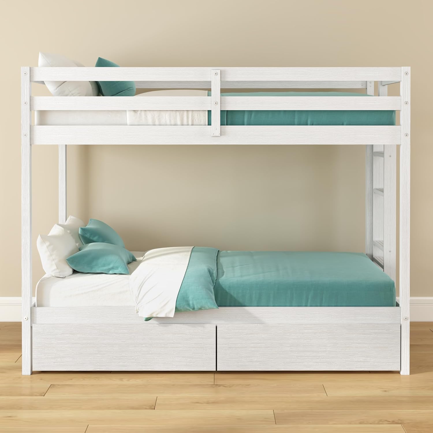 The Bear Twin Over Twin Bunk Bed with Storage from Grain & Grove is designed with families in mind, offering the perfect mix of practicality, safety, and value. Crafted from durable engineered wood, this wooden bunk bed ensures long-lasting use while prioritizing safety. The top bunk features 14" guardrails for added protection, while the ladder can be installed on either side for flexible placement. Sturdy wooden slats and a metal support bar support up to 400 lbs. per sleeping surface—no box spring or bunkie board required. What sets this bunk bed apart are the two spacious underbed drawers, providing built-in storage for clothes, toys, or bedding to help keep bedrooms neat and organized. Compact yet highly functional, the Bear Twin Over Twin Bunk Bed with Storage delivers a smart solution for shared spaces, combining durability, safety, and extra storage in one practical piece at a fantastic value.