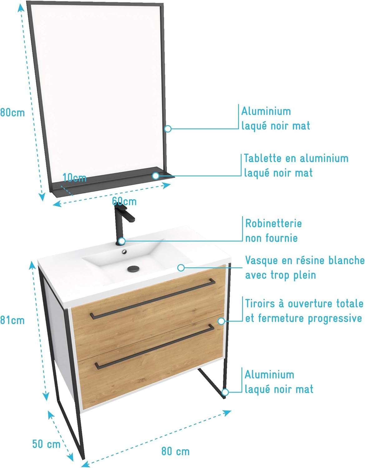 Structura P034 Bathroom Cabinet Pack 80 x 50 cm White 2 Drawers White Basin and Mirror Matt Black Matt white cabinet with two brown oak fronts + white resin basin + single mirror. Cabinet features: MDF cabinet and matt white melamine. White resin basin with overflow 2 drawers with total opening and gradual closing (soft close system). High quality metal drawer runners MDF drawer fronts with matt white finish. Feet, aluminium handles with matt black lacquered finish. Cabinet mounted except front panels. Tap not included. Cabinet dimensions: 80 x 50 x 81 cm. Drawer thickness: 18 mm. Basin dimensions: 80 x 50 cm. Bowl thickness: 4 cm. Mirror features: Matt black lacquered aluminium frame with shelf. Mirror dimensions: 80 x 60 x 10 cm.