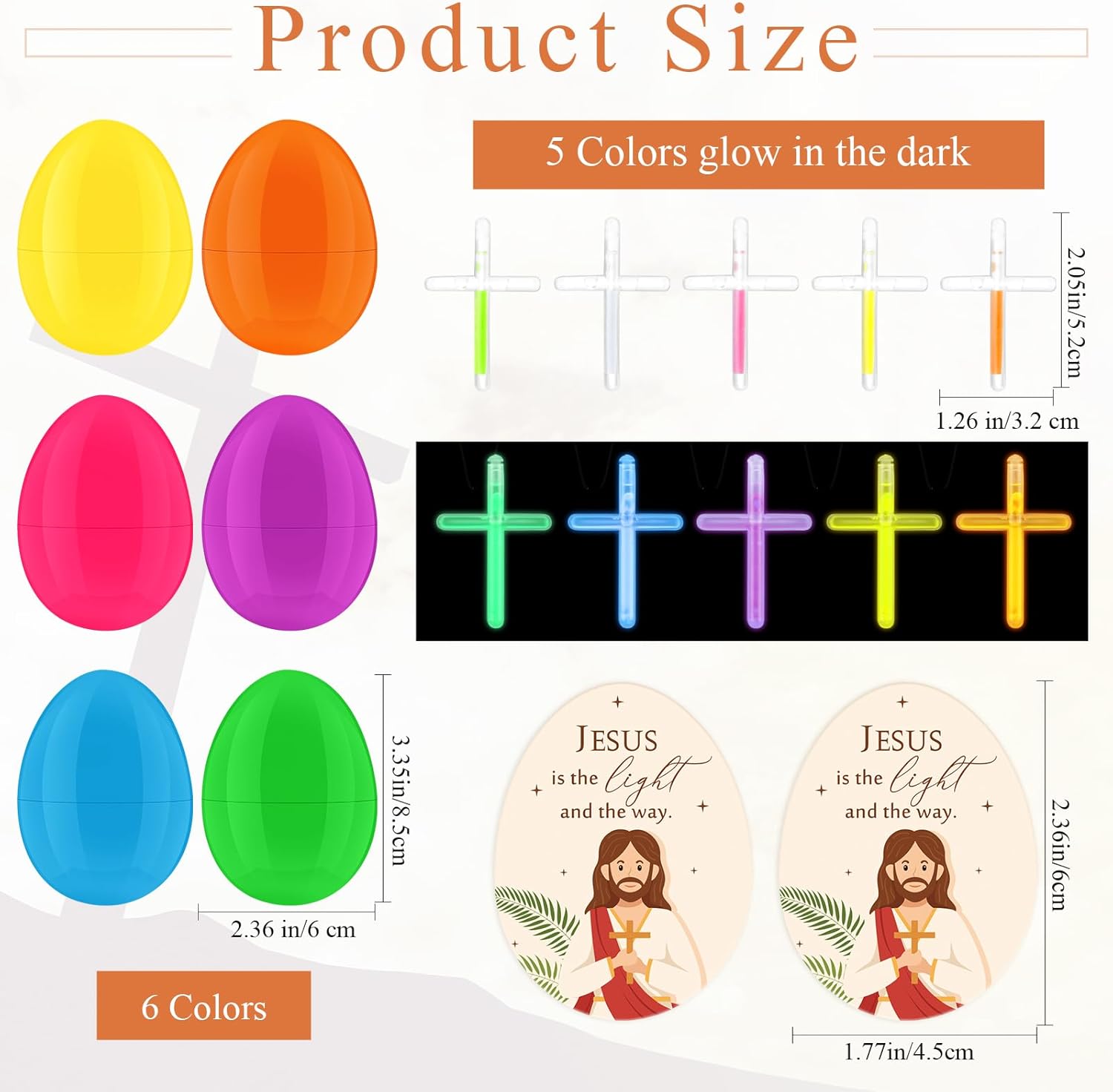 Features: Ideal for religious gatherings, church events, or religious parties, the easter party favor suits various occasions. Specifications: Material: plastic, double copper paper Color: multicolor Size: Easter eggs: 1.97 x 2.76 inches/ 5 x 7 cm Bible themed egg cards: 2.36 x 1.77 inches/ 6 x 4.5 cm Glow cross: 2.05 x 1.26 inches/5.2 x 3.2 cm Package includes: 72 x Easter eggs 72 x Bible themed egg cards 72 x glow cross Notes: Manual measurement, please allow slight errors on size. The color may exist a slight difference due to different screen displays