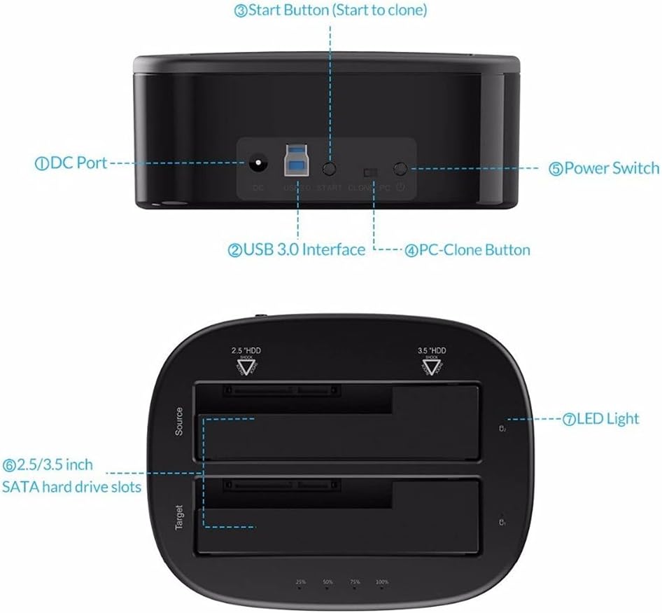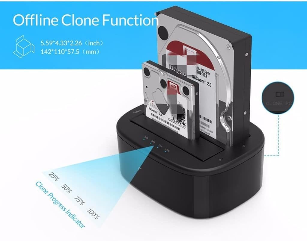 Dual-bay hard drive docking station.This docking station compatible with 2.5 inch or 3.5 inch HDD/SSD up to 16TB per bay, provide a more convenient way of transmitting data between your hard drive and computer through an available USB port. Data transfer rate can reach up to 5Gbps, 20% faster than traditional USB 3.0 with UASP Transfer Protocol; UASP functionality requires UASP capable controller and operating system Make sure that the USB cable is disconnected from your computer. Insert hard drive in the Source bay, other drive in the target bay(The capacity of Target drive must be equal or bigger than Source drive.) Turn the PC mode to the Clone mode Connect the power supply and turn on the power button, then press the Start The cloning process is complete when ALL the lights turn Blue (25%-). PS:1.Please backup files in the target hard drive before cloning. Any files in target hard drive will be overwritten when offline cloning occurs, If the Target Disk Data is Still Useful, Please Use your Computer to Make a Backup First. 2.To avoid data loss, do not remove or insert hard drives when drive is working in the docking station. 3.Make sure the USB cable is disconnected when using offline clone function Attention HDD/SSD is not included Please power off the docking station before removing Features ON/OFF power switch LED light indicates the working status 12V3A power adapter ensures enough power for devices Plug and play, hot-swapping, no drivers or applications needed Compatible with most major systems in market such as , Linux and OS Package list: 1x HDD Docking Station