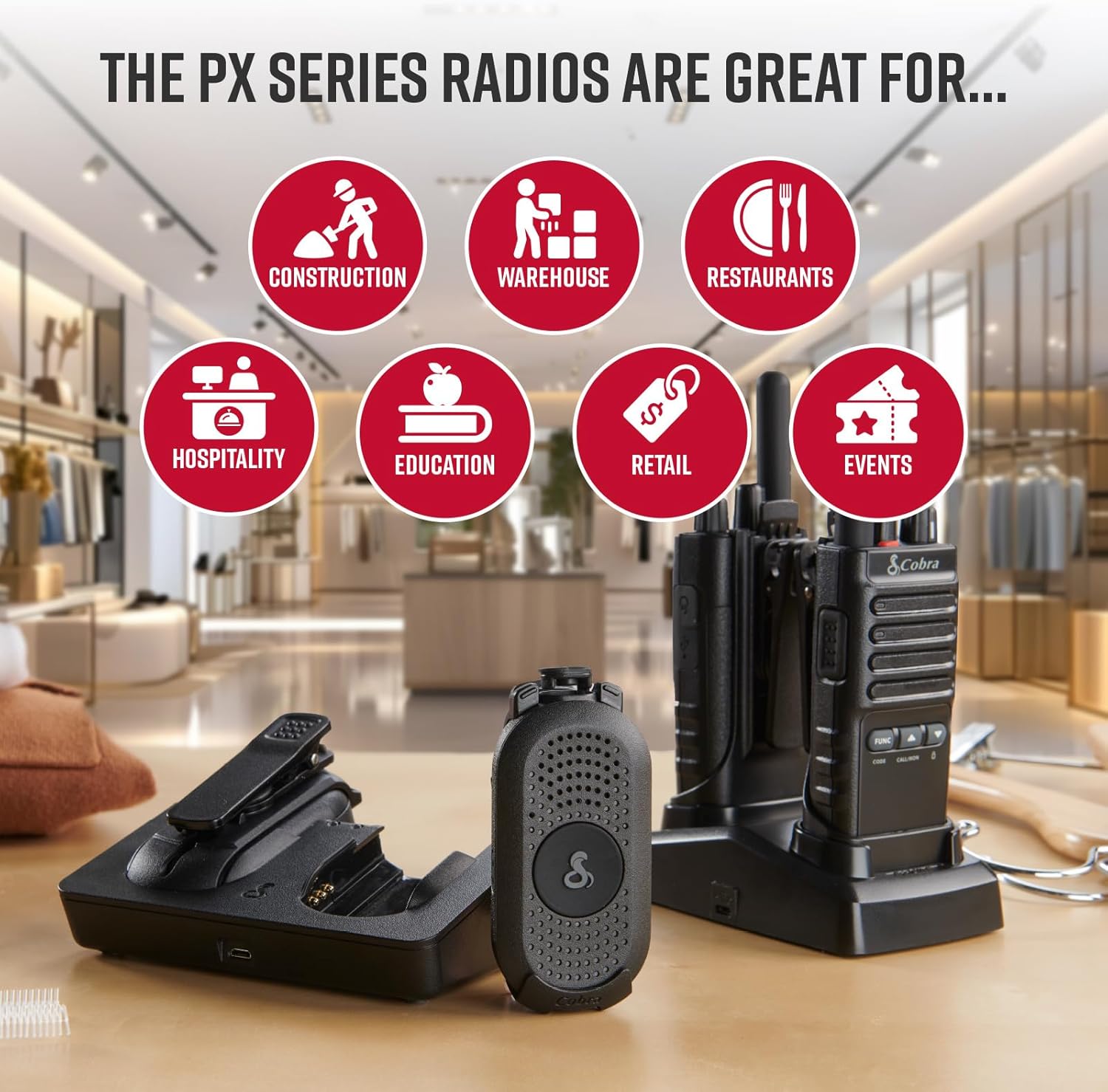 Stay connected, coordinated, and in control with the Cobra PX280 & PX650 4-Radio Bundle—a complete communication solution designed for any jobsite. This versatile set includes two PX280 compact radios with up to 12 hours of battery life and two PX650 long-range radios with up to 18 hours of runtime and coverage up to 25 floors or 300,000 sq. ft. Together, they give your team the flexibility of compact portability where discretion matters and extended range where coverage is critical. Built for business, these radios deliver clear, secure communication on high-quality, license-free FRS frequencies with 22 channels and multiple privacy codes to keep conversations private and interference-free. Both models feature a durable IP54 dust- and water-resistant design, making them reliable in demanding environments from hospitality to construction. With voice-activated transmission (VOX) for hands-free use, convenient dock charging, and long-lasting rechargeable batteries, your team can power through shift after shift. Pair each business radio with a jobsite-ready headset, enabling discreet, professional communication in customer-facing or high-noise environments (headsets sold separately). Backed by over 50 years of USA engineering and support, Cobra radios combine proven reliability with professional-grade performance—giving your team the tools they need to stay connected, wherever the job takes them.