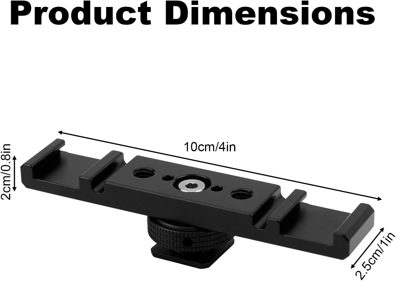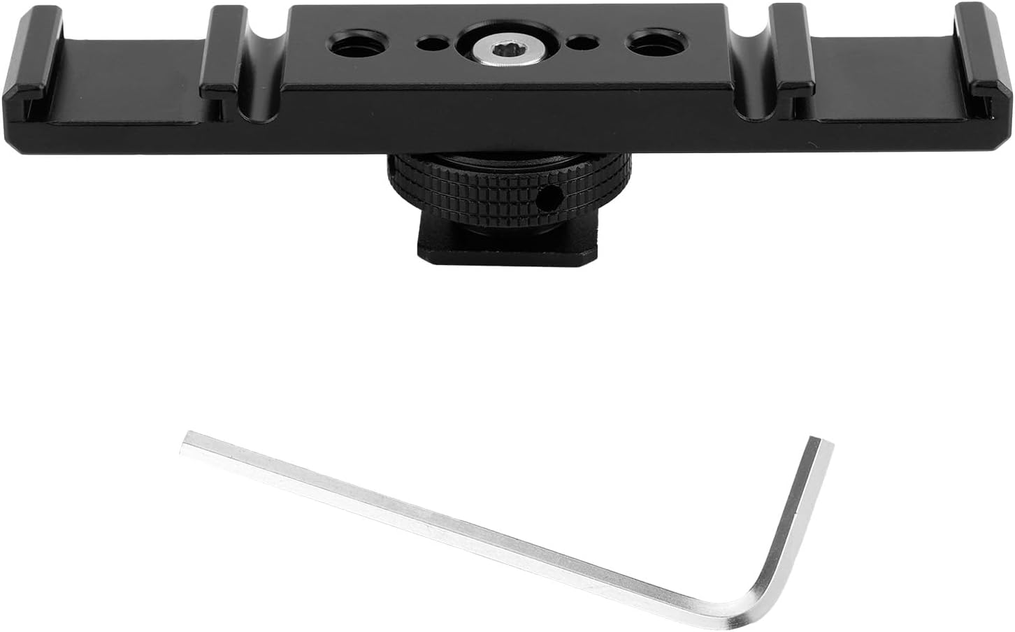 Specification: Color: black, silver Material: aluminum alloy Product Size: mount: 10x2.5x2cm/4x1x0.8in Package details: 1 x dual cold shoe extension bar mount 1 x hex wrench Note: Due to manual measurement, the size and weight may have a certain error. Due to the difference between monitors, there may be a slight color difference existed.