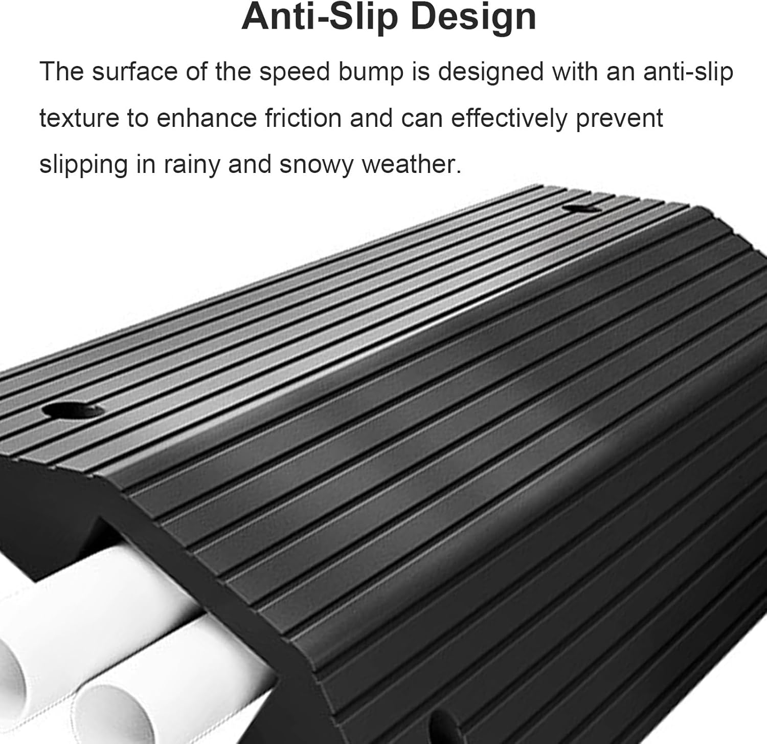 Introducing our multifunctional speed bump, expertly designed to enhance safety and manage traffic flow in various environments, including parking lots, warehouses, construction sites, and residential areas. This durable rubber speed bump serves as an effective solution for controlling vehicle speed, protecting valuable equipment, and ensuring a secure environment for pedestrians and drivers alike. With a thoughtful design that includes a unique groove at the bottom, our speed bump offers added protection for wires, cables, and hoses, preventing damage from passing vehicles. This feature makes it an ideal choice for locations where essential utilities are present, ensuring that your operational areas remain safe and functional. Key Features: - **Material**: High-quality rubber, providing resilience and longevity. - **Color**: Classic black, seamlessly blending into various environments. - **Size**: 30x14x3 inches, perfect for a variety of applications. - **Wire Trough Size**: 4.7x2.4 inches, accommodating multiple cables and hoses. - **Load Bearing Capacity**: Supports up to 10 tons (22,000 lbs), ensuring reliability under heavy traffic. - **Weight**: 24 lbs, making it sturdy yet manageable for installation. - **Installation**: Comes with expansion bolts for secure fixation. Included in the package are one cable protector and four expansion screws, providing everything you need for quick and easy setup. Whether you’re looking to enhance traffic control in a busy parking lot or ensure safety at a construction site, our speed bump is the perfect addition to your safety measures. Experience peace of mind with our reliable traffic management solution.
