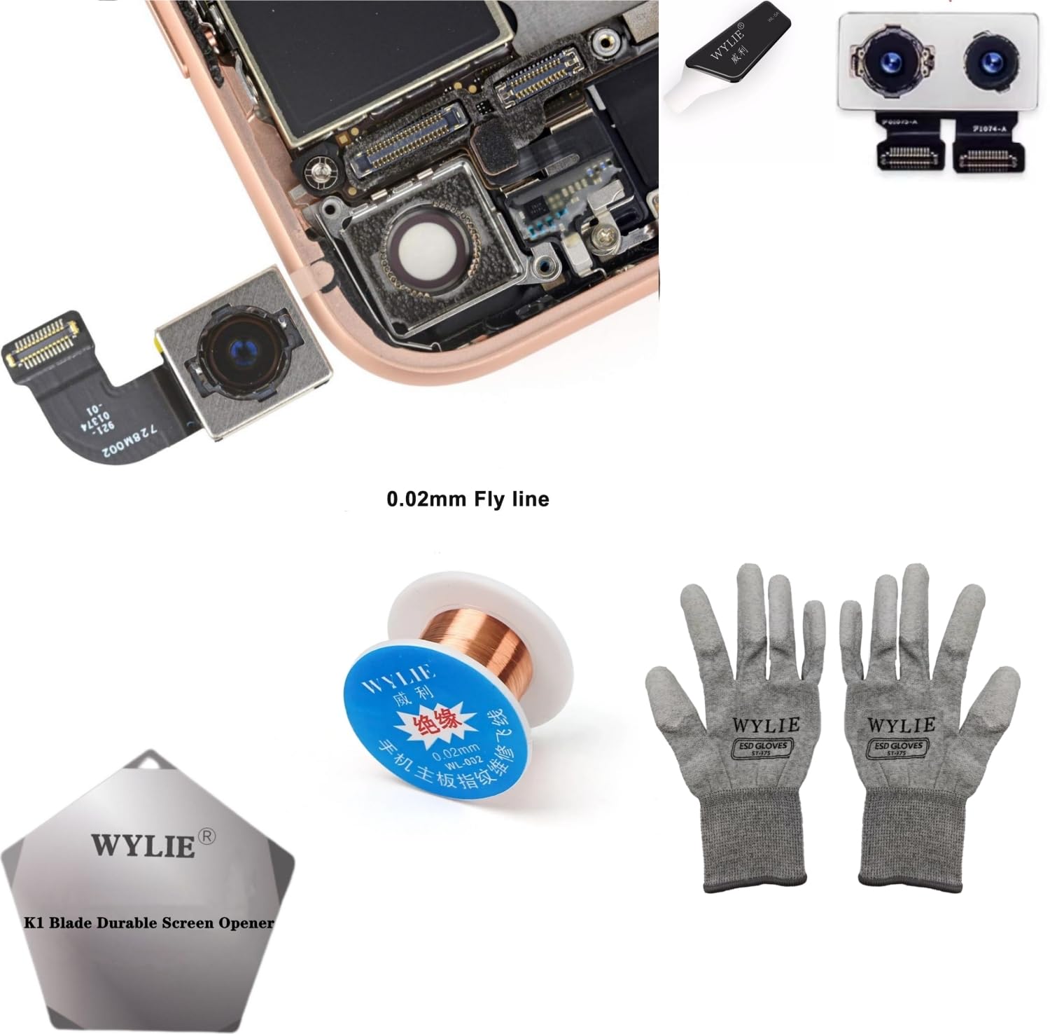Rear Camera Module Replacement for iPhone 8 and 8Plus 12MP Autofocus Main Back Camera Flex Cable with WYLIE Professional Repair Tools 7 Pack➤Product Description:🍀 ✔✿ - Transform your iPhone 8 8P repair capabilities with this comprehensive camera replacement kit;🍀 ✔✿ - The package includes a high-quality 12MP autofocus main rear camera module with flex cable, specifically designed for iPhone 8 8P across all carriers;🍀 ✔✿ - This professional repair set features six essential tools, including protective ESD gloves for handling sensitive components, a specialized K1 blade screen opener, and an ultra-fine 0.02mm fly line for precise work;🍀 ✔✿ - The included flex cable, equipped with a 16-pin connector and 16-inch length, provides ample workspace during repairs. The camera module ensures optimal image quality and seamless integration with your device. Perfect for both professional repair shops and DIY enthusiasts, this compact kit weighs just 12 ounces and comes in retail packaging measuring 12.0 x 8.0 x 1.5 inches;🍀 ✔✿ - The set includes WYLIE's specialized tools: a solder paste scraper, PVC functional card, carbon fiber gloves, superfine silver jump wire, and durable screen pry tool, making it a complete solution for precise phone repairs.📦➤Package Contents:✿- 2x Pack of for New OEM 12MP Autofocus Main Rear Back Camera Module Flex Cable Replacement Part Compatible for iPhone 8 iPhone 8P (All Carriers);✿- 1x PCS of WYLIE WL-5A Solder paste scraper slice;✿- 1x PCS of WYLIE name card PVC fine frosted plastic material functional card;✿- 1x Pair of WYLIE ESD BGA repaire soldering working antiskid protection carbon fiber gloves;✿- 1x PCS of WYLIE WL-002 Superfine silver jump wire 0.02MM copper wire ultra fingerprint chip repair;✿- 1x PCS of WYLIE K1 blade durable screen pry tool for iPhone for Android Huawei Oppo iPad Macbook screen tool.