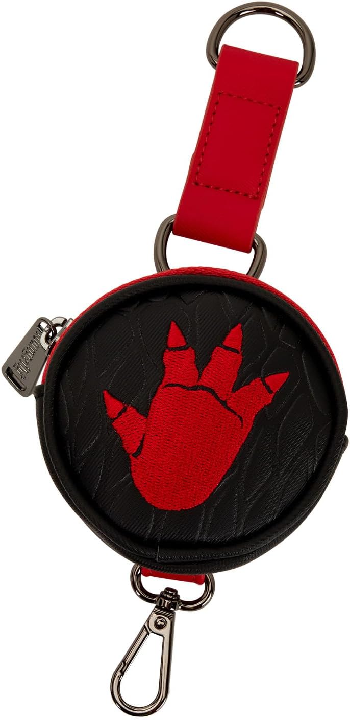 Show off your love for Godzilla with this crossbody bag! The front pocket features an image of Godzilla towering over a cityscape. A red sky is behind him. The rest of the bag is black and features scale-like designs over it. Attached to the crossbody strap is a detachable coin bag featuring an image of Godzilla's footprint. It's a fun piece that makes a statement and shows off one of your favorite monsters!