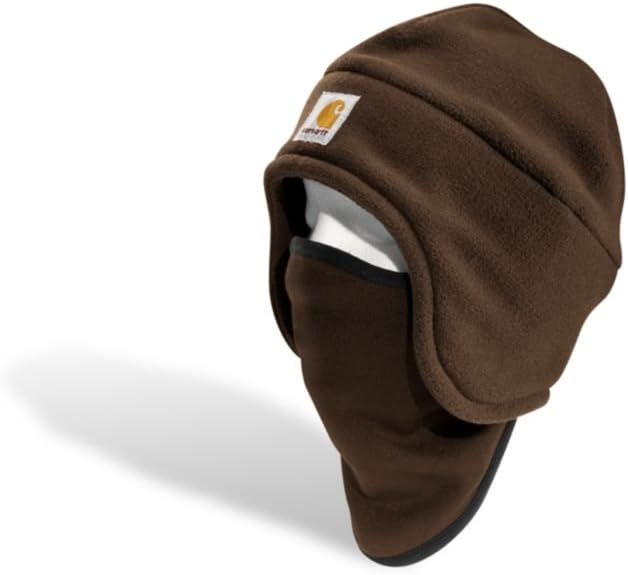 Carhartt's 2-in-1 fleece headwear combines a fleece hat with a pull-down face mask that tucks up into the hat when not in use. The hat is 100% polyester fleece and the face mask is a 90% polyester/10% spandex blend. For added comfort, the inner mask features a moisture-wicking finish. The carhartt logo is sewn on the front.