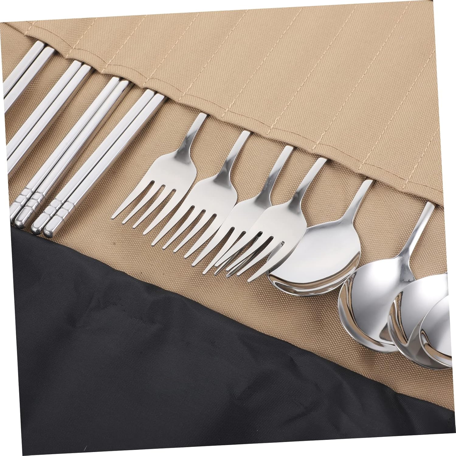 Package List 1 x Storage Bag 4 x Spoons 4 x Forks 4 x Pairs of Chopsticks Features - Size: 23.00X0.50X0.50cm/9.04X0.20X0.20in barbecue tableware set - Size: 20.60X2.40X2.00cm/8.10X0.94X0.79in picnic supply -Material:Stainless Steel, Nylon portable camping accessories -Color:Khaki(Bag),Silver(Tableware) outdoor gears - Size: 38.00X24.40X2.00cm/14.93X9.59X0.79in camping utensils - Size: 20.60X2.40X2.40cm/8.10X0.94X0.94in tableware pouch for camping -This cutlery's edges are polished smoothly, will not hurt your mouth, and reliable to use cutlery for picnic. -You can easily store cutlery, tableware, and many other small items, easy and convenient to use camping cutlery set. -The cutlery set comes in a roll storage bag, making it compact and easy to carry. for outdoor camping, hiking, picnics, hiking, barbecues, etc portable cutlery bag. -Roll storage, easy to carry, so that you go out more convenient. And you can carry it in your bag camping tableware set. -Allows you to roll it up to a compact package for easy transportation, which will not take up too much space tableware storage bag.Goods Informationtableware pouch for camping And the travel cutlery is easy to clean, reusable and suitable for everyday use.multifunction tableware pouch Made of , strong and , support long time of use.utensils with bag Say goodbye to wasteful plastic cutlery! A helper of outdoor camping, traveling and hiking etc