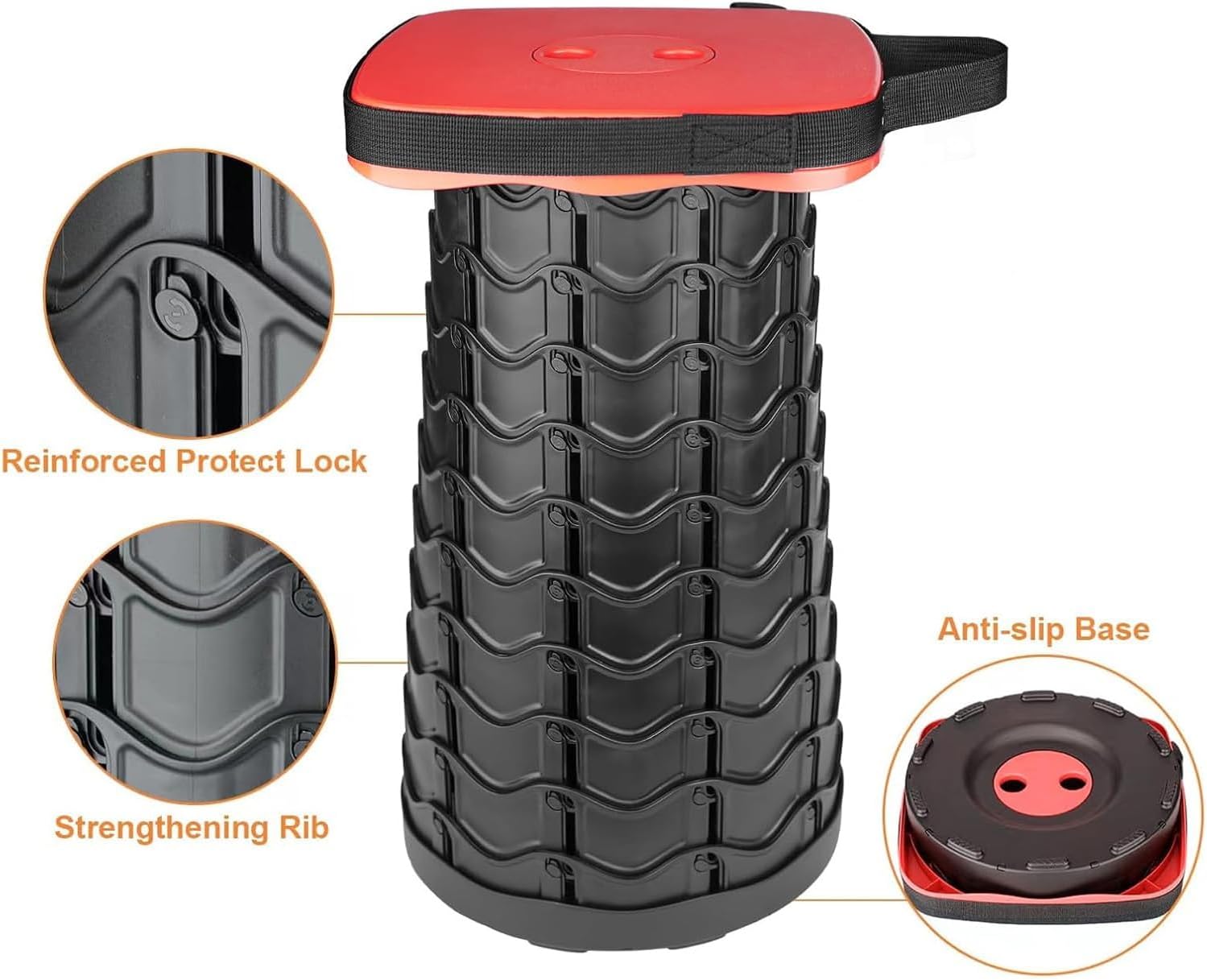Compact Foldable Camp Stool Nylon Design For Fishing, Picnics & Quick Outdoor SetupFeatures:Engineered with innovative telescopic folding design and nylon, this portable camping stool offer adjust height (12" 18") and 330lbs weight capacity for versatile outdoor adventures.The stool folds into a compact with easy assembly, featuring anti slip feet and reinforced joints for stability on uneven terrain.Ideal for hikers, anglers, and family campers seeking seating way during extended outdoor excursions or spontaneous backyard gatherings.Perfectly adapts to campsite cooking stations, lakesides fishing spots, tailgate parties, and children's outdoor activities with its quick deploys functionality.Weather-resistant nylon construction ensures performances, maintaining structural integrity from sandy beaches to mountain.Specifications:Component: Engineering NylonColor: Black/Red/BlueHeight: Approx. 17.71inch(45cm)Package Includes:1x Folding StoolNote:Please allow 1-2cm errors due to manual measurement.Due to the differences between different monitors, the picture may not reflect the actual color from the item.