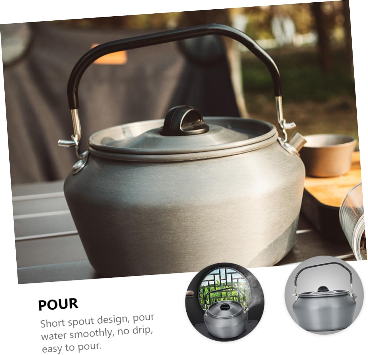 Package List 1 x Teakettle Features - Size: About 17.10X17.10X11.20cm/6.72X6.72X4.40in outdoor water kettle - Color: Assorted Color tea kettle - Material: Stainless steel, aluminum alloy, PVC outdoor kettle - Capacity: Rated 1.2L, full capacity 1.5L tea kettle for outdoor - The of the lid and mouth are designed rolled in case the splashes when boiled outdoor kettle pot. - Anti-ironing , easy to operate and comfortable to handle boiling kettle. - Short spout design, pour smoothly, , easy to pour hiking kettle. - Especially for hiking, backpacking, camping, traveling, fishing and picnic camping . - Can be used as a camping teapot or coffee pot, for boiling , tea, coffee, hot drinks and soup boiling teapot.Goods Descriptionoutdoor kettle pot High resistance to scratch and easy to clean.picnic kettle Satisfy the requirement of boiling at home or outdoor camping, picnic, and travel.boiling teapot This is a camping teapot, made of , very strong and can be used for a long term.hiking kettle Compact and lightweight.outdoor water kettle The design with strong handle is convenient to use