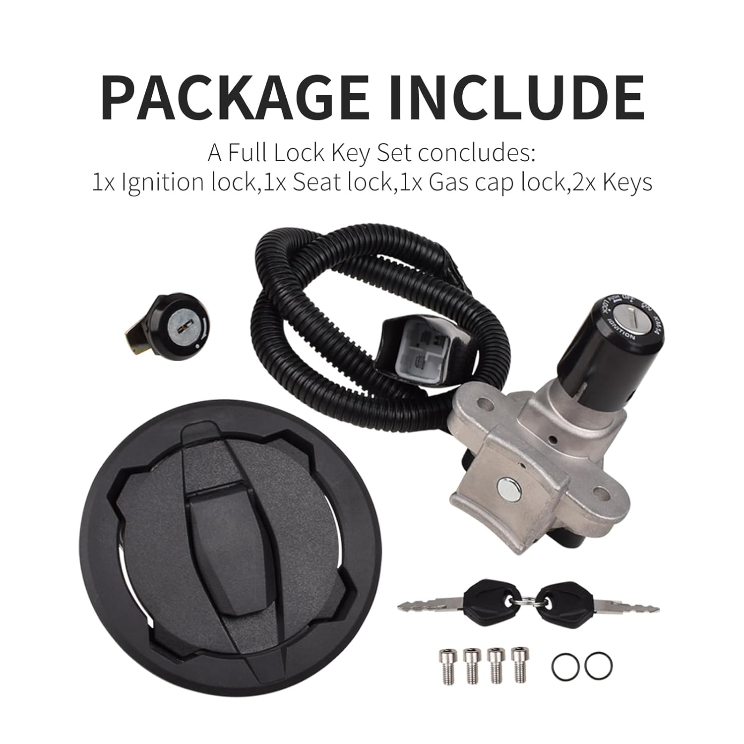 [Commodity] 100% high quality and brand new. [Material] High quality, easy install,and durable. [Fitment] Compatible with Kawasaki KLX230 2020-2023;. [Package List] 1 * Ignition lock; 1* Seat lock;1 * Gas cap lock;2 * master Keys . [Friendly Tips] Due to manual measurements, please note some differences. Due to the difference between the display and the light, the picture can not reflect the true color. Thank you for your understanding. Thoroughly inspect the quality assurance before delivery to achieve high quality.