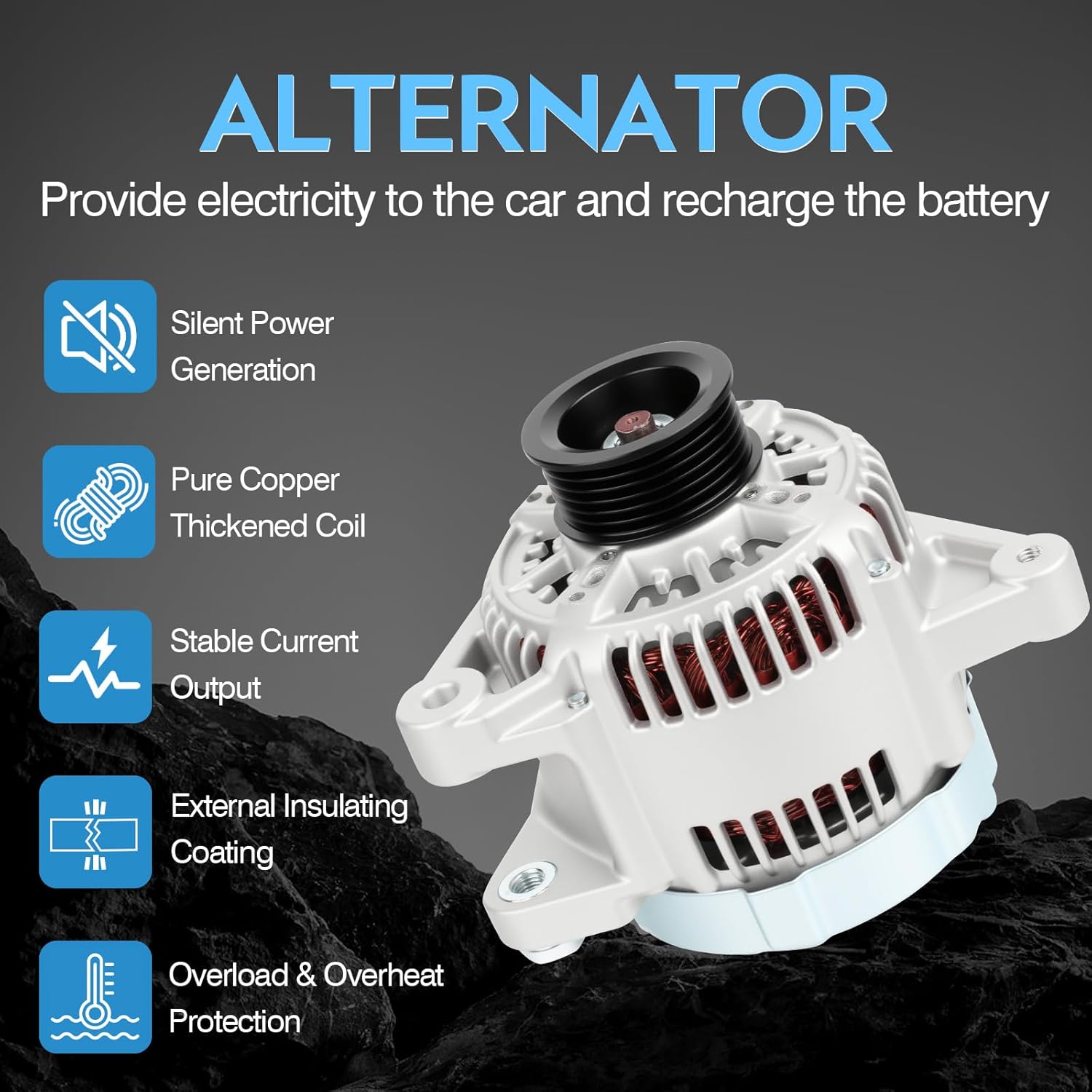 Reference OE part number:13806N, 13806, 101211-7670, 121000-3800, 27060-0A040, 27060-0A040-84, 27060-20090, 27060-20090-84, 1012117670, 1210003800, 270600A040, 270600A04084, 2706020090, 270602009084,3341350, 334-1350, 40052051, 400-52051Ensuring compatibility and adherence to original equipment standards. Crafted from premium metal material, it offers exceptional impact resistance and durability, making it a reliable component for your vehicle. Specifications Unit Type: Alternator Part Type: UNIT Voltage: 12 Rotation: CW Amperage:100 Amp Regulator:L-iG-S Fan Type: IF Fitment (Please refer to the compatibility table for specific vehicle models.)For Toyota Avalon 1998-1999 For Toyota Sienna 1998-2003