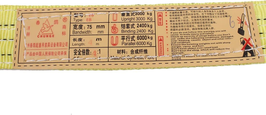 Aexit 4 Meter 75mm Width Eye to Eye Nylon Web Lifting Tow Strap Yellow (64d2552523d35b3de7a390a5a10bb731)The lifting strap for lifting machine, eye to eye design tow strap.Straight capacity 3000kg, Chocker capacity 2400kg, and Basket capacity 6000kg.Upright(1M) 3.0T, binding(0.8M) 2.4T, (2M) 6.0T, angle 45degree (1.8M) 5.4T, angle 90degree(1.4M) 4.2T, angle 120degree(1M) 3.0T.Description in FrenchSangle de remorquage, longe en nylon, toile de nylon de 4 mètres, largeur 75 mm, jauneNom du produit: sangle de levage; largeur: 75 mm / 3' 'Longueur: 4 mètres / 13Ft; Épaisseur: 4mm / 0.15' 'Capacité: droite: 3000kg / 6613lbStockeur: 2400kg / 5291lbPanier: 6000kg / 13226lb; Matériel: NylonCouleur principale: Jaune; Poids: 950gContenu de l'emballage: 1 x sangle de levage