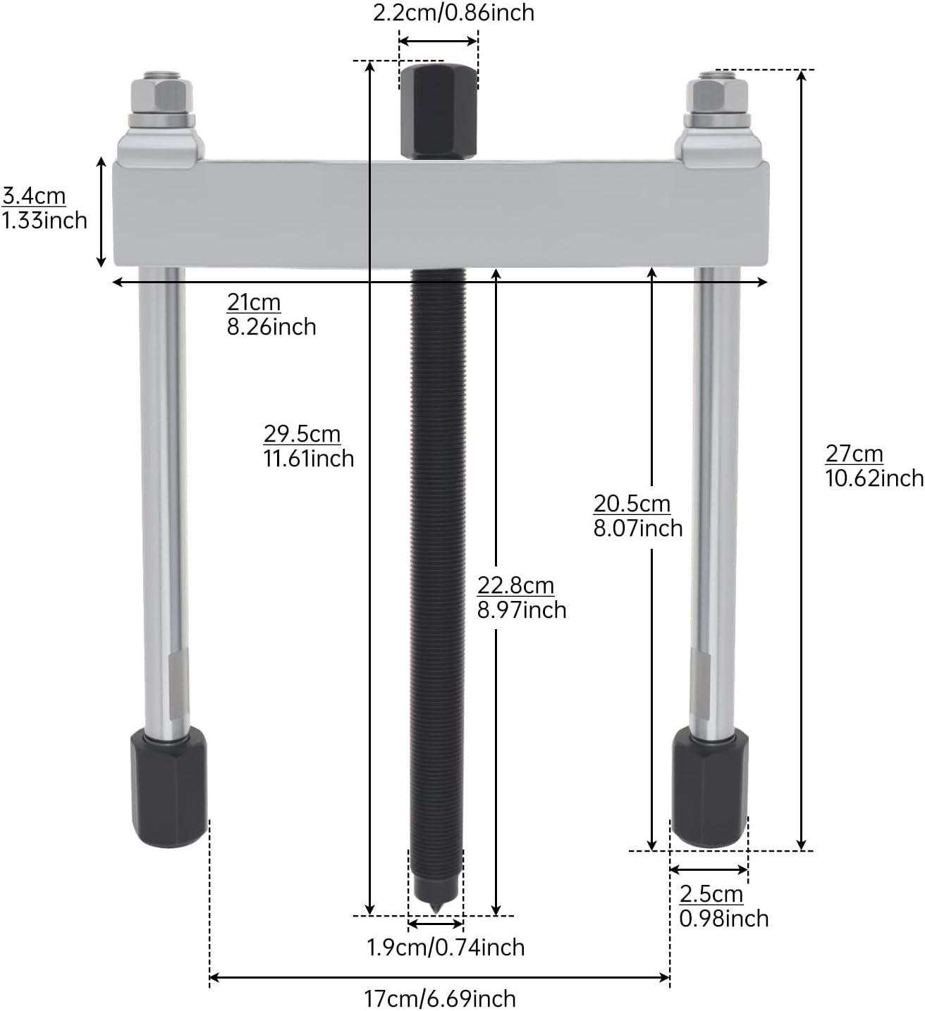 Material: Chrome Vanadium Steel Surface Treatment: Chrome plating Number of Claws: Two-claw Type: Claw Puller Product Name: Chrome-Plated Steel Bearing Puller Features: - Made of high hardened 4140 impact grade steel with chrome-plated, which is great strength, rust resistance and serviceable to use. - 10 tons of pulling power. - The maximum extension range is 8.97 inches. Spread of 6.69 inches. Puller legs are 8.07 inches long. - The push puller can be used with several attachments, a bearing, or pulley puller attachment. - Used to easily remove a wide range of gears, pulleys, or other parts that have tapped holes. Package Include: 1 x Push Puller
