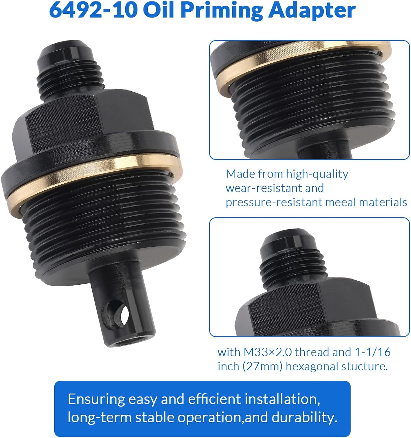 Features and Benefits:Installs into the oil priming port in the oil moduleFor use with the engine oil primer p/n 6492For use on Detroit Diesel DD13 and DD15 engines. Similar to J-49181This adapter allows for proper engine pre-lubing,preventing dry starts after engine serviceSpecification:Thread Size: M33 x 2.0Hex Size: 1-1/16 in (27mm)Material: High-Grade Aluminum AlloyProduct Size: 2 × 1 × 1 inNet Weight: 1 lb