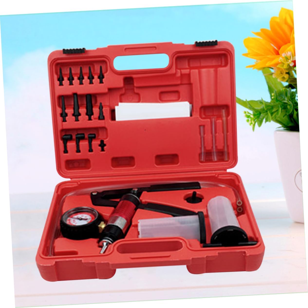Package List 1 x Hand-held Vacuum Goods InformationVacuum fuel , , etc.Hand-held Vacuum - Material: Alloy.Brake Bleeder Kit fuel , , et.Manual vacuum - Manual with pressure gauge allows testing of many vacuum operated systems, eg.steam protection tool 5 cm. - Comprehensive workshop vacuum kit includes reservoir and adaptor for brake and fuel line bleeding. - Works on all vehicle makes and models. Manual with pressure gauge allows testing of many vacuum operated systems, eg. Features - Color: As shown. 5 x 27 x 7. - Size: 37. - The hand operated pulls the fluid through the bleed , eliminating need to use the brake lever or pedal. - Easily bleed brakes and test automotive vacuum systems . Comprehensive workshop vacuum kit includes reservoir and adaptor for brake and fuel line bleeding. The hand operated pulls the fluid through the bleed , eliminating need to use the brake lever or pedal