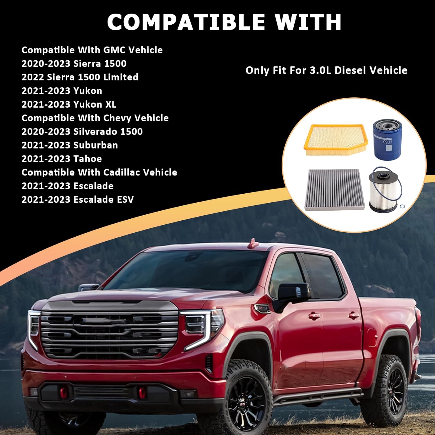 【Package Include】 1 * Fuel Filter: TP1015 1 * Oil Filter: PF66 1 * Cabin Filter: 13508023 1 * Air Filter: A3244C / 84121219 Replaces Part Number: #TP1015, PF66, 13508023, A3244C ( 84121219 ) Compatible with GMC Vehicles: 2020-2023 Sierra 1500 2022 Sierra 1500 Limited 2021-2023 Yukon 2021-2023 Yukon XL Compatible with Chevy Vehicles: 2020-2023 Silverado 1500 2021-2023 Suburban 2021-2023 Tahoe Compatible with Cadillac Vehicles: 2021-2023 Escalade 2021-2023 Escalade ESV Attention: This Filter Kit Only Fit 3.0L Duramax Diesel Engine Warranty: Our Diesel 3.0L Duramax Filter Kit Has 1 Year Warranty. All Products Shipped Are Tested And Easy To Install. We Offer True Worry-free Shopping And Convenient Refund Policy Experience. 100% Brand New And High Quality Guaranteed.