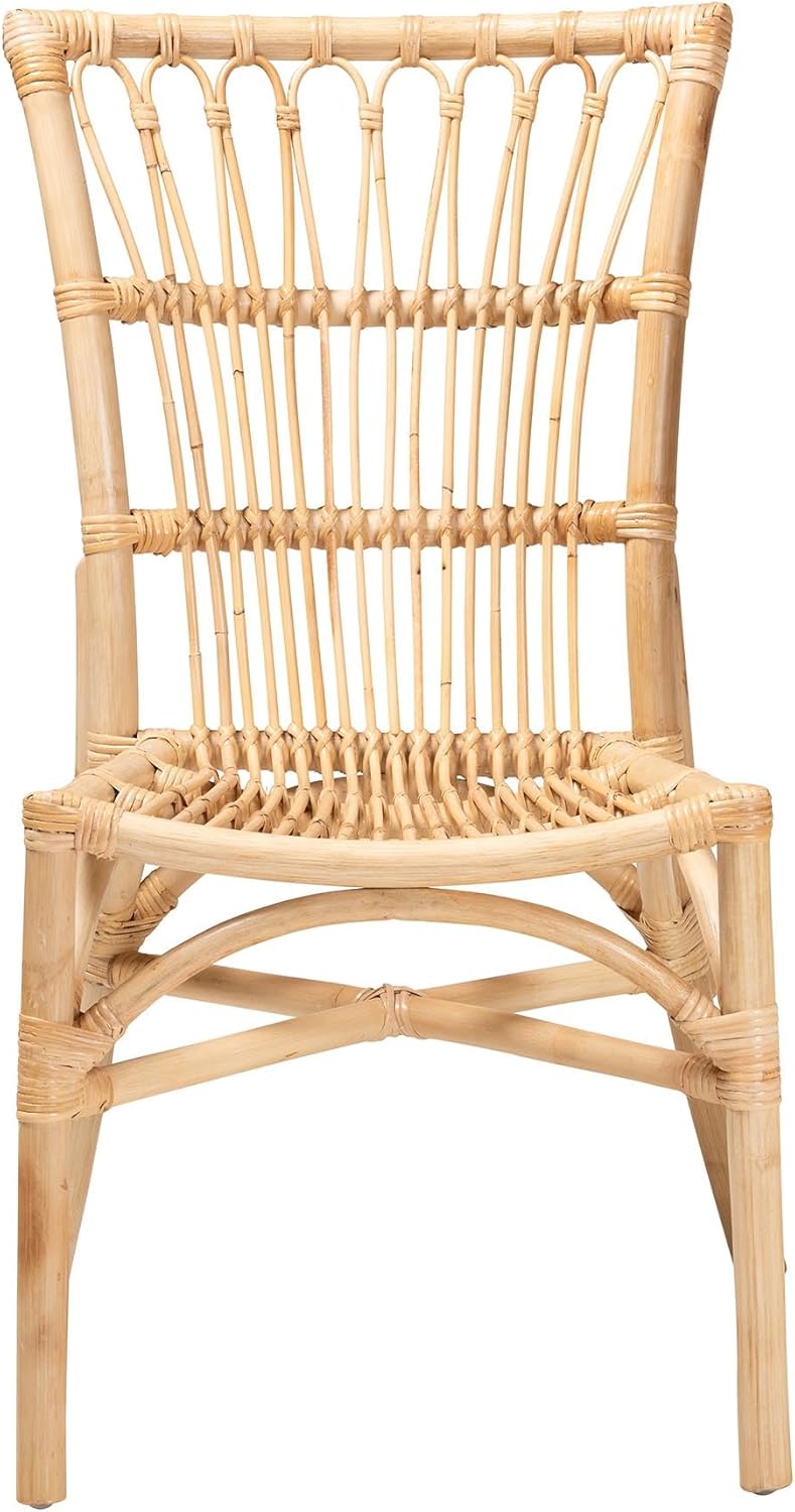 Build a charismatic yet carefree scene in your space with the alluring design of the Ammi dining chair. Made in Indonesia, this chair is made from natural rattan with woven embellishments. Its prominent backrest features slim rattan rods that form a smooth embrace while allowing light to flow naturally throughout the room. The Ammi will arrive fully assembled and utilizes angled legs connected by a crisscross base for excellent stability and support. Expertly made with distinct craftsmanship, the Ammi dining chair grants an unforgettable impression to any occasion. Due to the nature of the natural materials used in this product, it may have variations in areas such as, but not limited to, color, pattern, grain and texture. The hair-like strands of rattan/rattan-fiber are common due to nature of the material.
