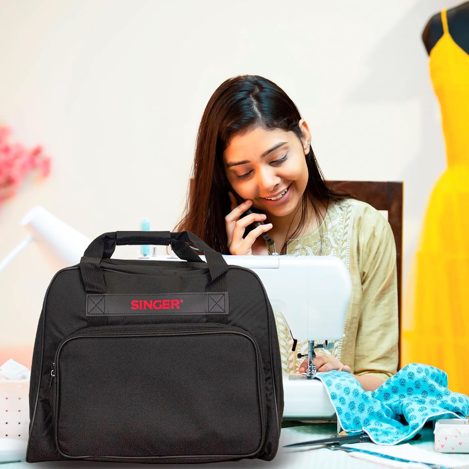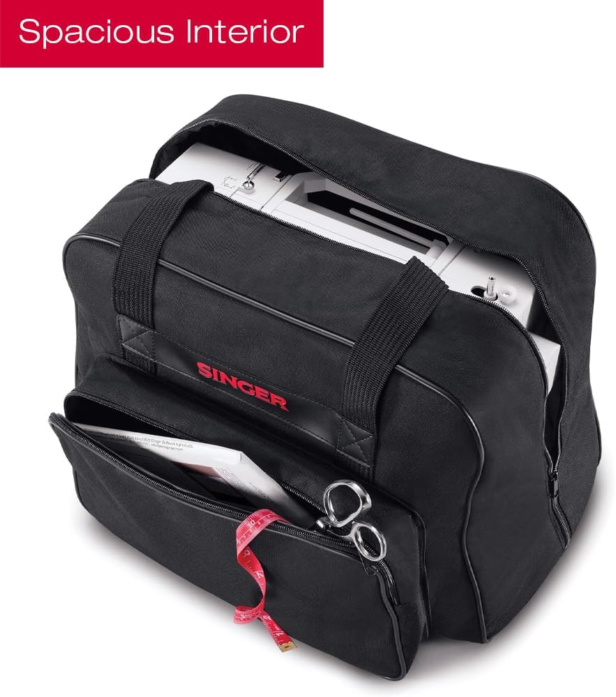 Protect your sewing machine on the go and at home with the SINGER universal black tote bag. This bag is the perfect size for your SINGER portable sewing machine or serger. The bag is 18 inches long, 10 inches wide, and 13 inches high. The full zip makes it easy to get your sewing machine in and out, and the padded carrying handles can be joined for a more secure hold.Designed to offer safe, dust-free storage of your sewing machine or kits, also protect from bumps and scratches, and impact resistant. The Sewing Machine Bag is designed as a carrying case as well as a storage bag so you can easily take your sewing machine to a class, a meeting or on holiday.Care Instructions: Spot clean with a mild detergent and allow to air dry.HighlightsProtect your sewing machine on the goZipper and handlesSafe and dust-free storageDimensions: 18” x 13” x 10"