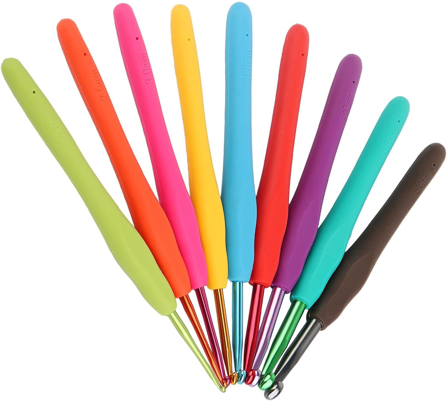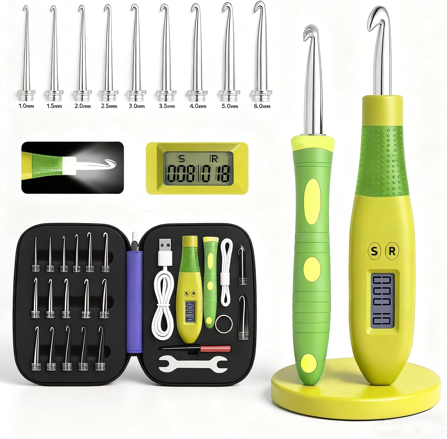 | Included Components | 12 metal (2.0-8.0mm) + 6 jumbo clear (9.0-14.0mm), digital counter handle, ergonomic grips, soft tape measure, yarn needles, 10 markers, rings & illustrated guide |