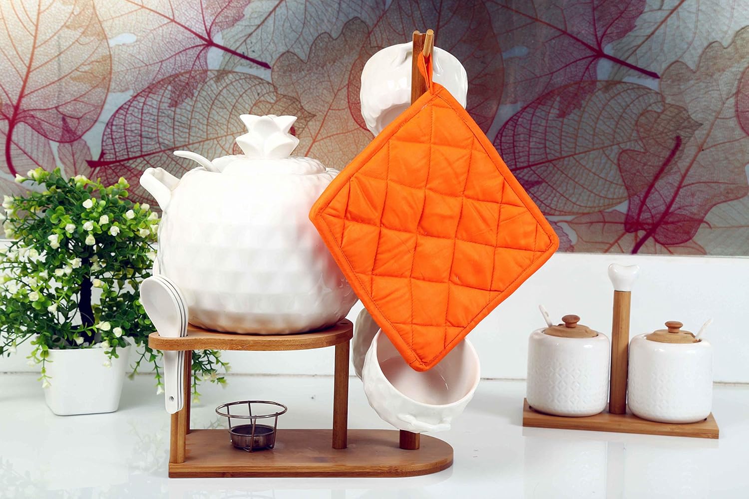 Cotton cloth is a favorite material for creating highly functional kitchen textiles. The Cotton cloth loops offer softness and comfort while the thickness increases its sturdiness and longevity. Potholder sets are available in many colors to coordinate with your kitchen. Great for everyday use. These Pot Holders are a great basic kitchen essential with multiple colors for your choices to mix and match with your home and kitchen.