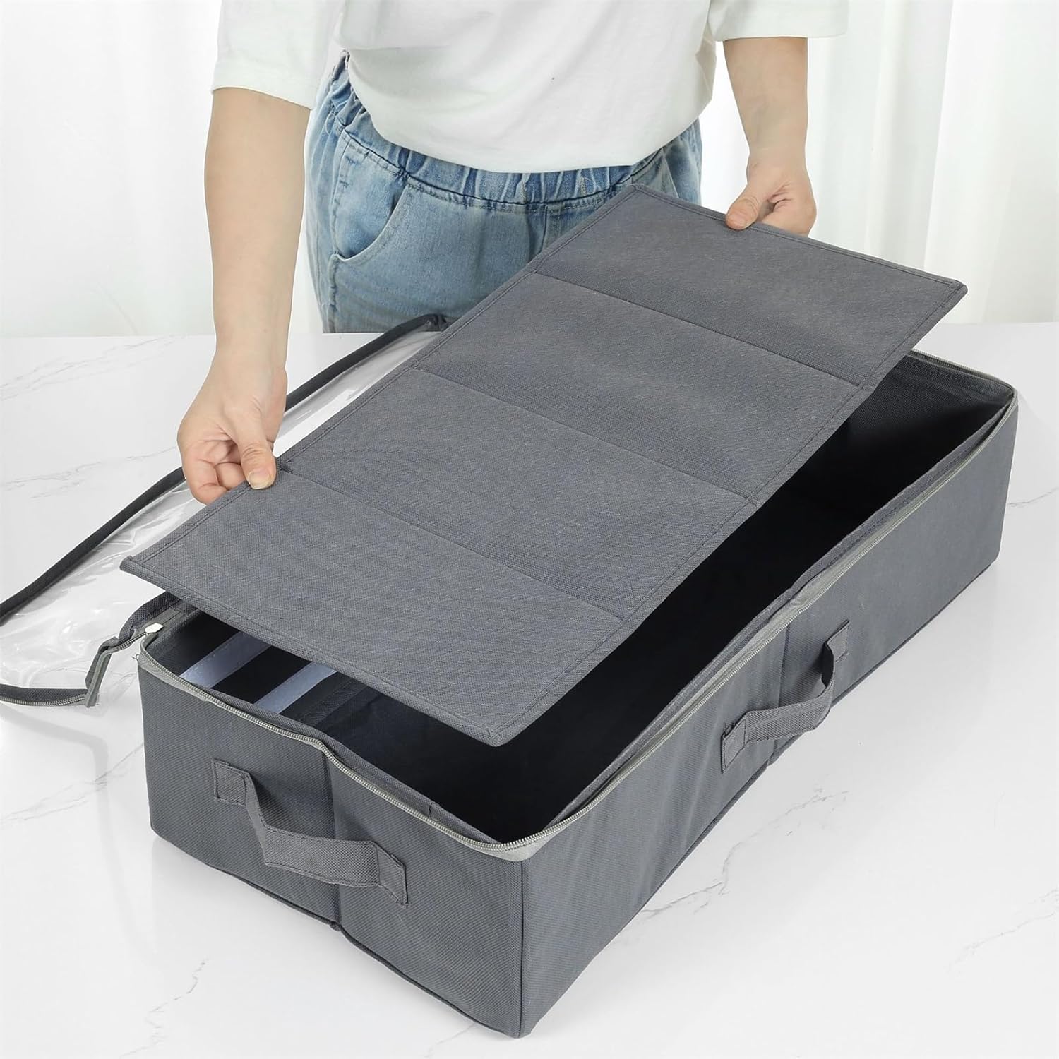 Shoe organiser comes with a transparent dust cover. Not only keeps dust out but you can see if the shoes you want are there without having to open it up.Don’t ever think you have too many shoes, all you need is more storage, and under the bed organizers is the perfect solution.Under bed shoe organiser, makes it easier to find your shoes at a glance, it is convenient for you to classify all shoes for easy and smooth opening and closing.It is spacious for your to store sports shoes, high heels, boots, clothes, toys, etc.ROOM SPACE SAVER AND EASILY FOLDS UP- Put it under the bed, in the closet, or in virtually any small space available in the room and keep your shoes perfectly organized, perfectly stored, and put it wherever you please.Package Include:1 x Under Bed Shoe Organizer.At the same time, which also prevents any odour leaking, and stops bugs from entering. It can keeping all shoes clean and organised and out of the way until you need them again.