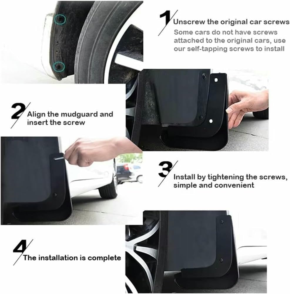 WHY DO YOU WANT TO INSTALL CAR MUDGUARDS?1.The original car lacks the protection of mudguards, and the muddy muds encountered in the rainy days will splash the car body.2.IN THE RAIN OR MUDDY ROAD, IS THE CAR FULL OF MUD?3.The body is smashed into difficult to remove stains is not very troublesome, no fenders really can not afford to hurt, muddy water, scratching paint.4.fenders effectively protect the bottom of your car from snow, salt, sand, dirt, mud, stones and other foreign objects thrown from the wheels, thus minimizing the risk of dust.Specification:Product name : Car MudguardsApplicable position: front and rear wheelsMaterial: ABS plastic【Installation instructions】:1.Please look at the back of the mud flaps. There are words showing directions:left front, right front, left rear, right rear.2.In installation, original screws of the corresponding parts in the car should be removed firstly.3.Make sure that the mud flaps are well placed to protect corresponding parts of the car.4. As for very few car models, if the original car don't have screw holes, please directly rotate our self-tapping screws into your car.【Package included】:4 x Mud Flaps(2 pcs Front L/R , 2 pcs Rear L/R)1 x a Bag Of Screw FixingsNote:1.Please check the model number in the picture and text carefully before placing an order, make sure your car model is correct