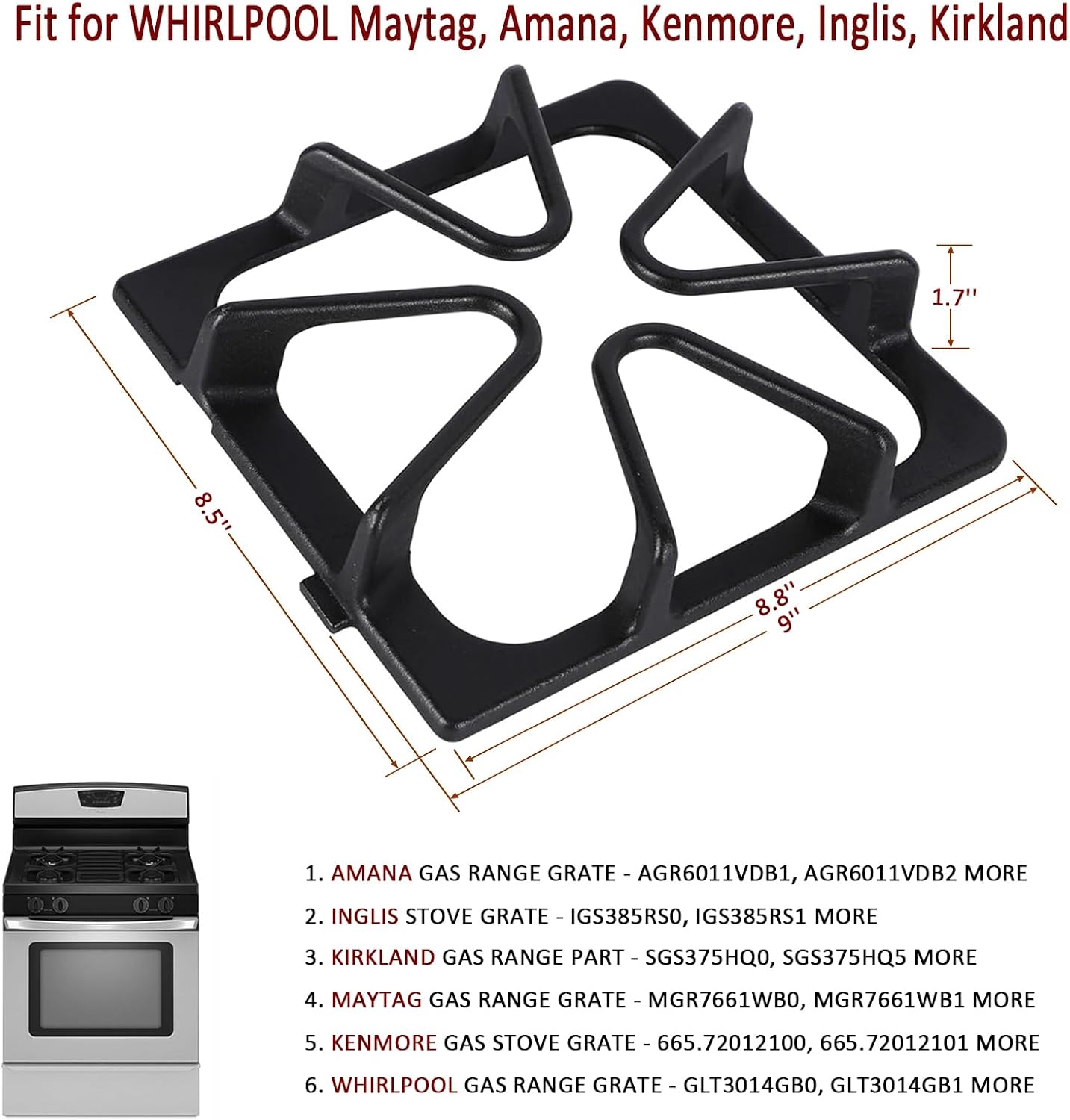4 Pcs Whirlpool Burner Grate-W10447925 W10165803 Durable, heat-resistant, perfect match, easy to clean and long-lasting, the Whirlpool Grate provide a seamless cooking experience. Dimension: 8 3/10" L x 9" W x 1 3/4" H Package: 4 Pcs Whirlpool Stove Grate Material: Upgraded Porcelain Enamel Cast Iron