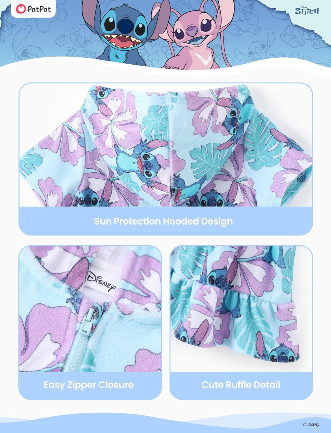 It's a sunny day at the beach, and your little girl is playing at the beach or pool, needing a stylish yet functional cover-up that keeps her dry and comfortable. 1.The Disney Hooded Swim Cover-Up is designed to offer the best of both worlds – softness and quick-drying properties, thanks to its premium terry cloth fabric.2.With adorable Disney's Minnie Mouse prints, your child can showcase her favorite characters while staying cozy. 3.The protective hood offers extra sun coverage, while the ruffle hem adds a fashionable touch. 4.Featuring a zipper closure, it ensures easy wear and removal, making it a must-have for summer adventures.5.Whether for beach vacations, pool parties, or daily outings, this official Disney-licensed swimsuit cover-up is the ultimate choice for style, comfort, and fun. Get yours today and let your little one shine in her favorite Disney look!