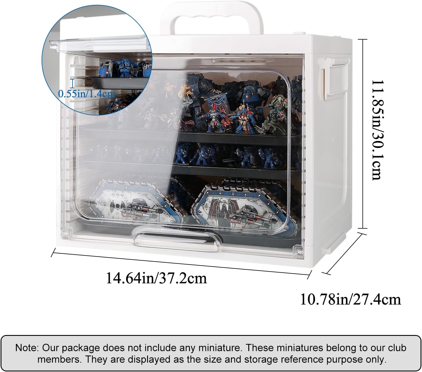 The item is predominantly white in color, requires self-assembly, and contains metal trays that can be adjusted between the two trays according to the height of the miniatures.
