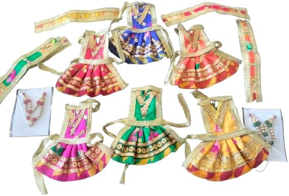 Maa Durga / Lakshmi / Saraswati / Parvati idol Dress /Chunri / Patka & Lehanga Dress (Mala Set) for Goddess Durga/Lakshmi/Saraswati/Parvati (Devi Dress) ( Navratri Special) . multicolor. Every Dress is different design and color .. This lehenga & patka / chunri set is a wonderful goddess dress to adorn your Girraj Ji / Maa Durga / Lakshmi / Saraswati / Parvati. Serve your Mata Rani with this amazing stylish & latest design dress. This fancy poshak of Devi Ji is in bright and rich colors. Does not accept Return so please verify Length or size and place your order. Specifications