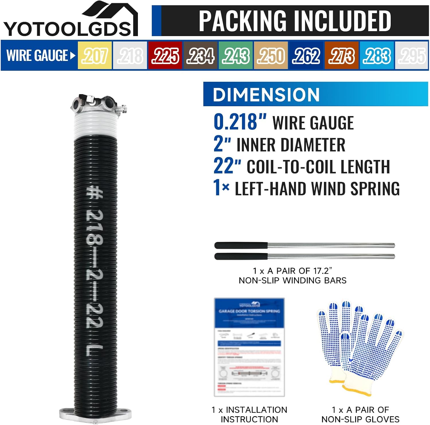 | Included Components | PACKING INCLUDED : Single Side Garage Door Torsion Spring, A pair of 17.2’’ Non-Slip Winding Bars and Gloves, and Installation Instructions are included in the package, so you can start installing immediately after receiving the product. |