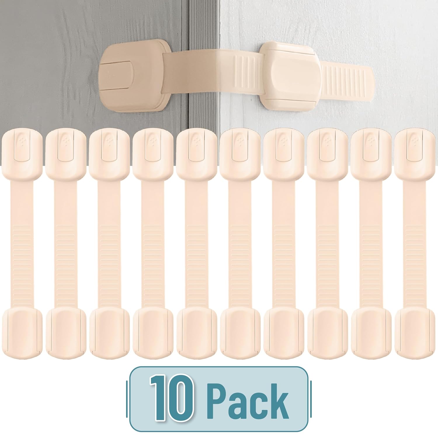 Bates child safety strap locks come in a 10-pack designed to help secure cabinets, drawers, appliances, and doors to reduce access for children.These safety locks are made of durable plastic that is built to withstand daily use while maintaining a smooth, low-profile appearance.Each strap is adjustable from 3 inches to 7.7 inches, allowing a flexible fit for a wide range of furniture and household items.The adjustable strap design allows for easy customization while keeping doors and cabinets firmly closed when properly installed.The neutral beige color blends seamlessly with most home décor, making these locks suitable for kitchens, bathrooms, and living spaces.