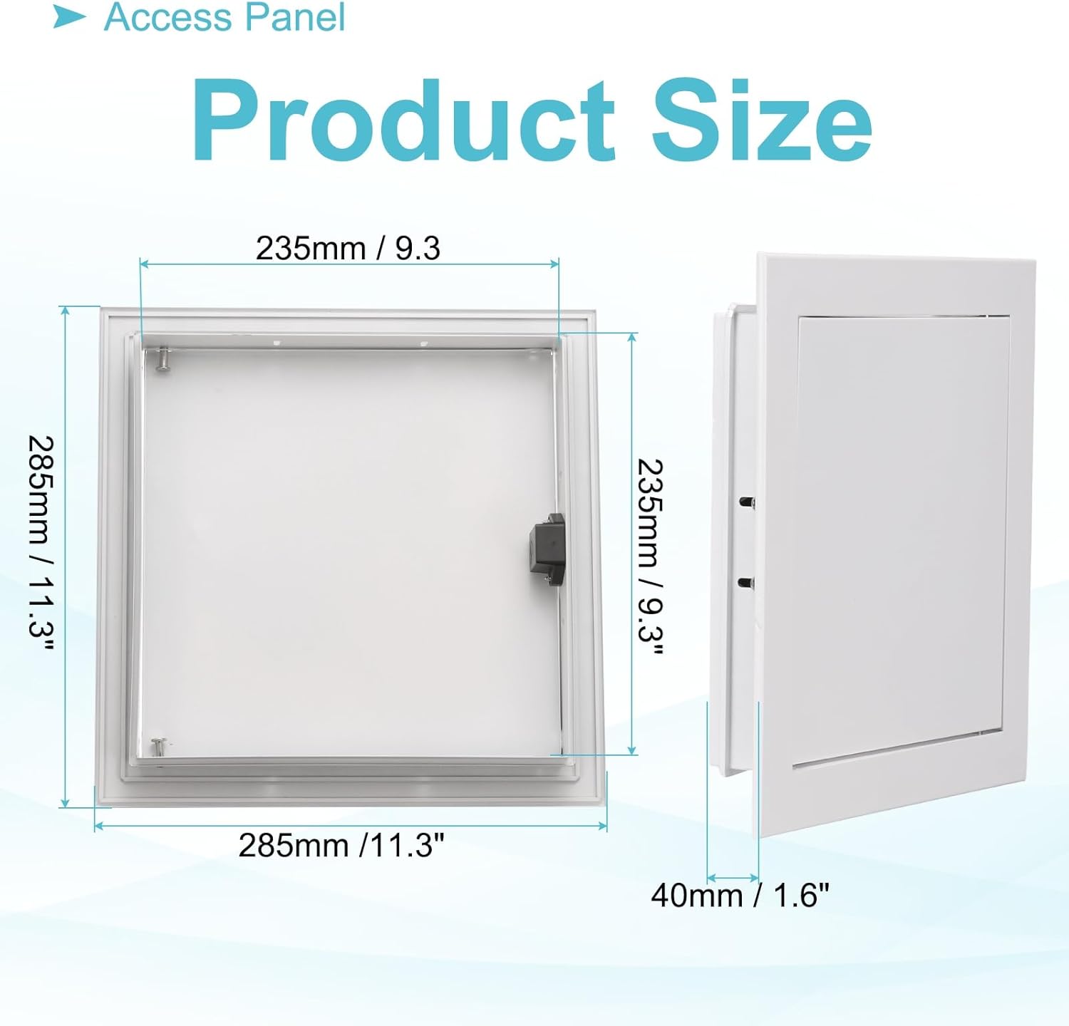 The drywall access panels are designed to hide inspection openings for your wire, gas, water, unsightly holes, electrical counters, and other building equipment. Provide easy access to plumbing, electrical systems, sprinkler system applications, or duct systems.SpecificationColor: WhiteMaterial: Aluminum Alloy, Galvanized IronExternal Size: 285 x 285 x 40mm / 11.22 x 11.22 x 1.57 inch (L*W*H)Internal Size: 235 x 235mm / 9.25 x 9.25 inch (L*W)Packing List: 1 Pcs x Access PanelAdvantageThis access panel for drywall is made of impact-resistant aluminum alloy, features durability, and is stable in daily use. It is also waterproof and can be installed in basements or bathrooms. The unique magnetic lock design, one-click opening/closing for easy maintenance.InstructionAttach the access door to the matched size wall opening, and fasten with screws or sealant. The practical design of the hinges ensures simple and convenient opening of the door, as well as firm stability of the door in the frame.NOTE: Embedded installation, please purchase the matching model. Otherwise, it can not be used.