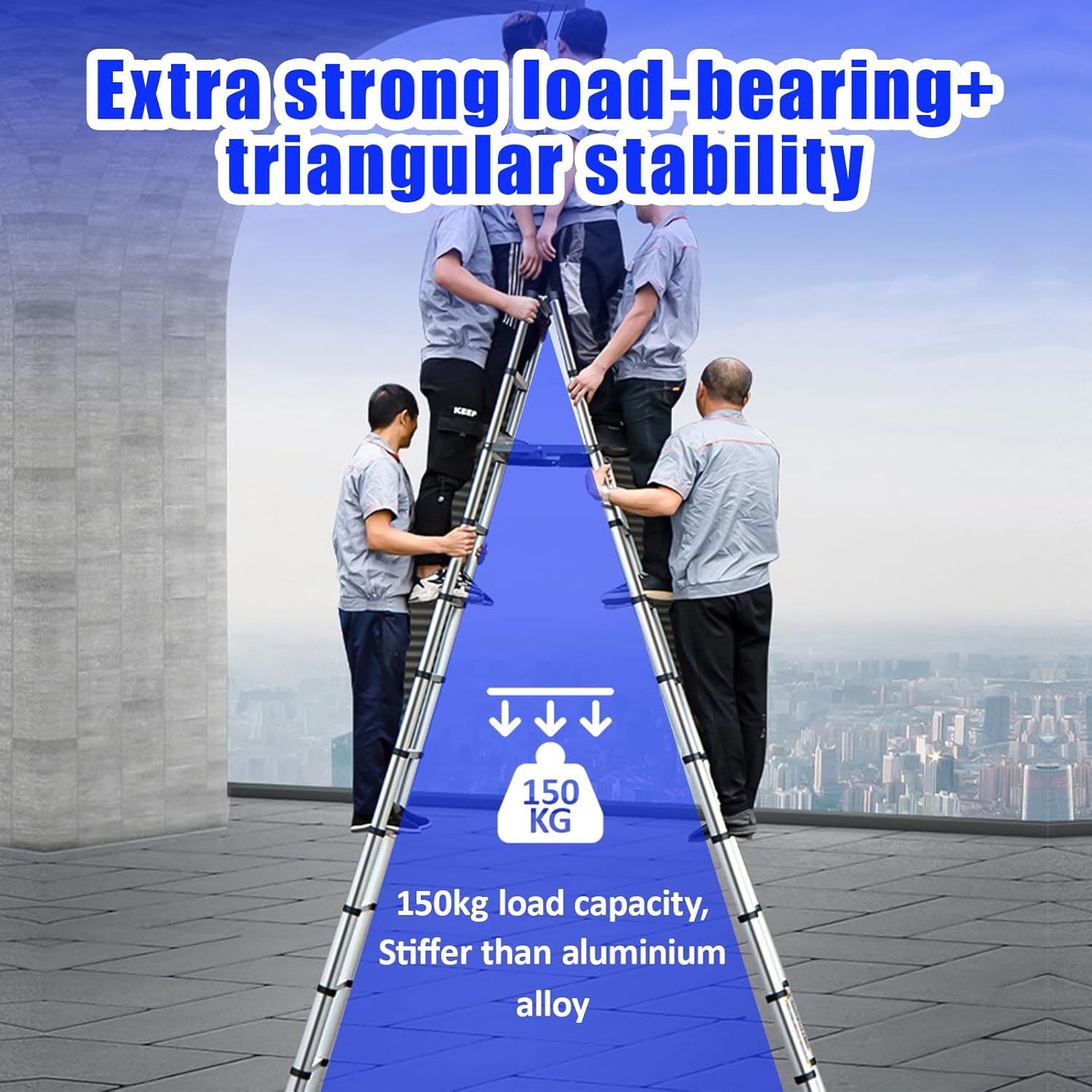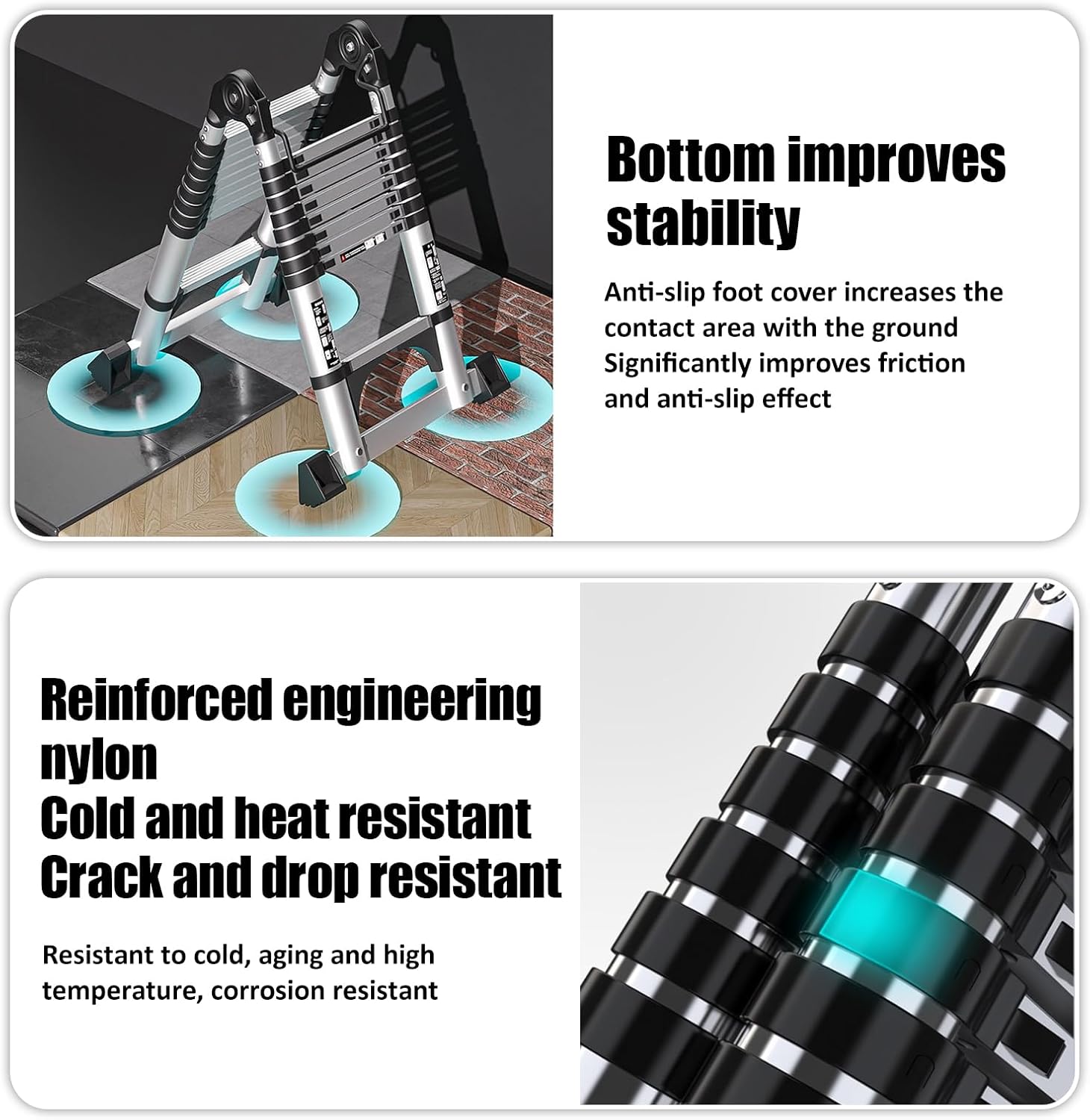 YUEWO Telescopic Ladder – The Ultimate Professional-Grade Solution for Outdoor Work! Crafted from premium stainless steel, this heavy-duty ladder excels in construction sites and rugged outdoor environments. With dual-sided extension capability (8.2ft single-side / 16.4ft fully extended), it delivers unmatched flexibility and rock-solid stability. Key Features: 6 Reinforced Steps & Double-Sided Design 330lb Load Capacity – Supports tools and users simultaneously Anti-Corrosion Stainless Steel – Built to withstand rain, snow, and extreme temperatures Safety First: Includes 2 Non-Slip Rubber Feet that grip uneven surfaces securely, preventing accidental slips. The interlocking joint system ensures smooth extension/retraction without finger pinching risks. Multi-Scenario Mastery: From garden repairs and roof access to professional contracting jobs, this portable ladder folds down for easy transport. Its space-saving design fits in trucks, garages, or storage sheds. Upgrade your worksite efficiency – Order Now and experience why professionals trust YUEWO ladders for critical heights! Please feel free to contact us with any questions.