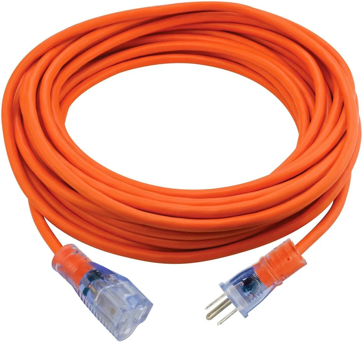 The perfect solution for your outdoor extension cord needs. This combo pack includes two 50 foot heavy duty, 12 gauge extension cords suitable for use with lawn mowers, snow blowers, generators and serious power tools. The 50 foot length makes it lighter to carry around and easier to coil up than a 100 foot cord when you don't need that extra length. The 2 foot triple head adapter cable is a handy way to provide 3 outlets to either of the 50 foot cords. Each cord has a lighted end to show that it's connected and ready to use. Perfect for Canadian winters, these cords stay flexible down to -40C and are highly visible.