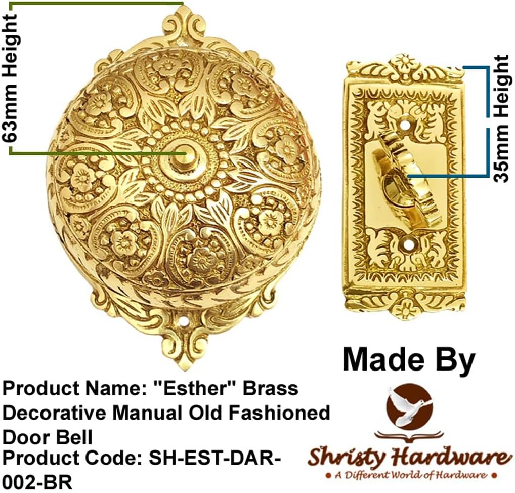"Esther" Brass Decorative Manual Door Bell is created out of high quality Solid Brass material. Our exclusive Satin Nickel Finish makes it stay for many years to come. It can be the very key in bringing your home design altogether. Door Bell is best solution to add quality and style on your main door and Antique look you’re your Front Door. Mount this door Bell on your front door and change the look of your door immediately! No more boring wireless doorbell and Impress your guests with the antique look of this decorative doorbell chime with this Door Bell. It is creatively crafted from Brass for a sturdy, long lasting Brass Door Bell. The product structure is simple and suitable for various Exterior or interior decorations, such as living rooms, study rooms, bedrooms, etc…HANDMADE HOUSE DOOR BELL BY SHRISTY HARDWARE:The strength of Solid Brass material together with the Polished Lacquered finish makes this Door Vintage Door Bell sturdy and durable. It looks beautiful on fixed on your entrance, bedroom or office door in no time this knocker can be a decorative at the main door or gate of your house!WE SURE 100% CUSTOMER SATISFACTION GUARANTEE!Don’t Hesitate! ORDER NOW to receive our Decorative Brass Door Bell and decorates your home!