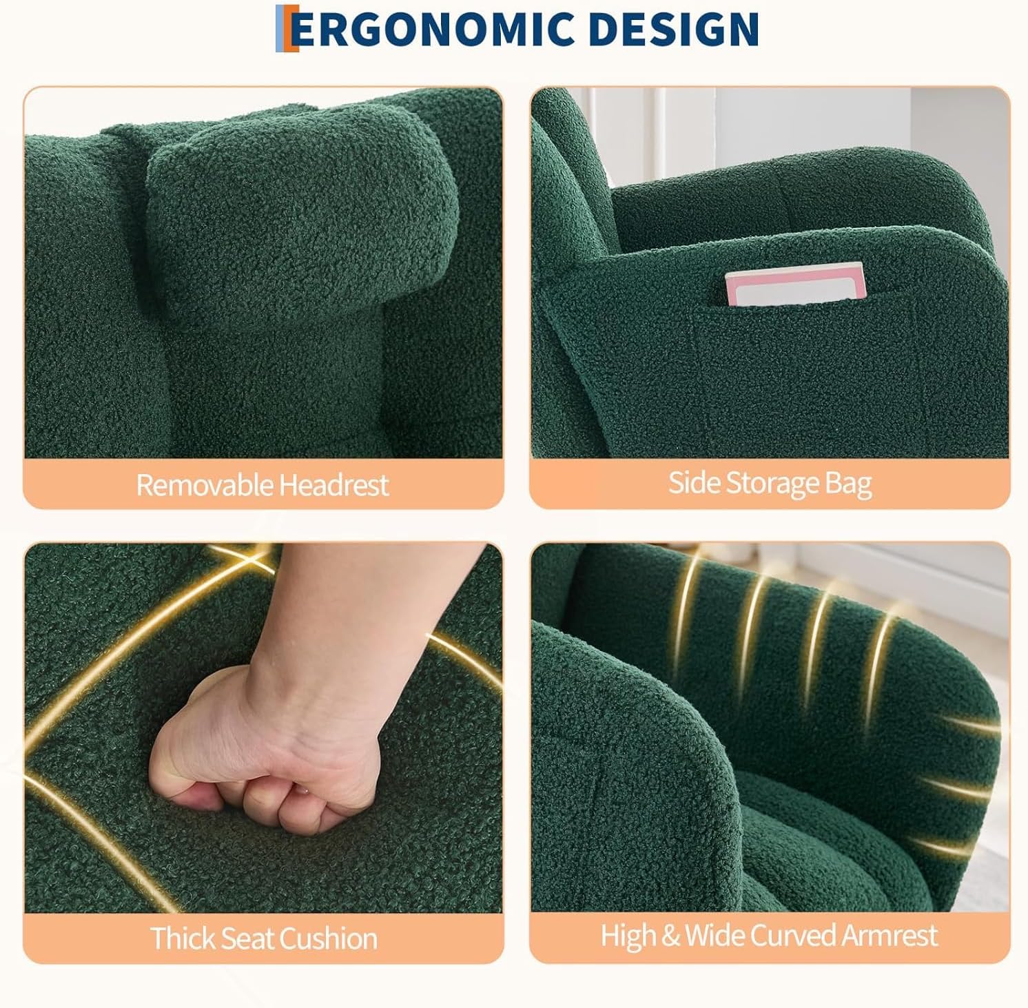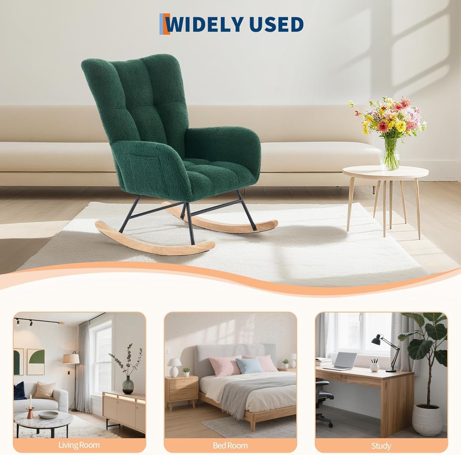 • COMFORTABLE FABRIC : Both the backrest and seat cushion are generously filled with high-density sponge, providing enhanced elasticity and resistance to deformation.The surface of the rocking chair indoor is made of soft teddy fabric, which is gentle on the skin, comfortable and soft. The entire leisure rocking chair is soft enough for you to fully enjoy and relax your body and mind after a tiring day at work.