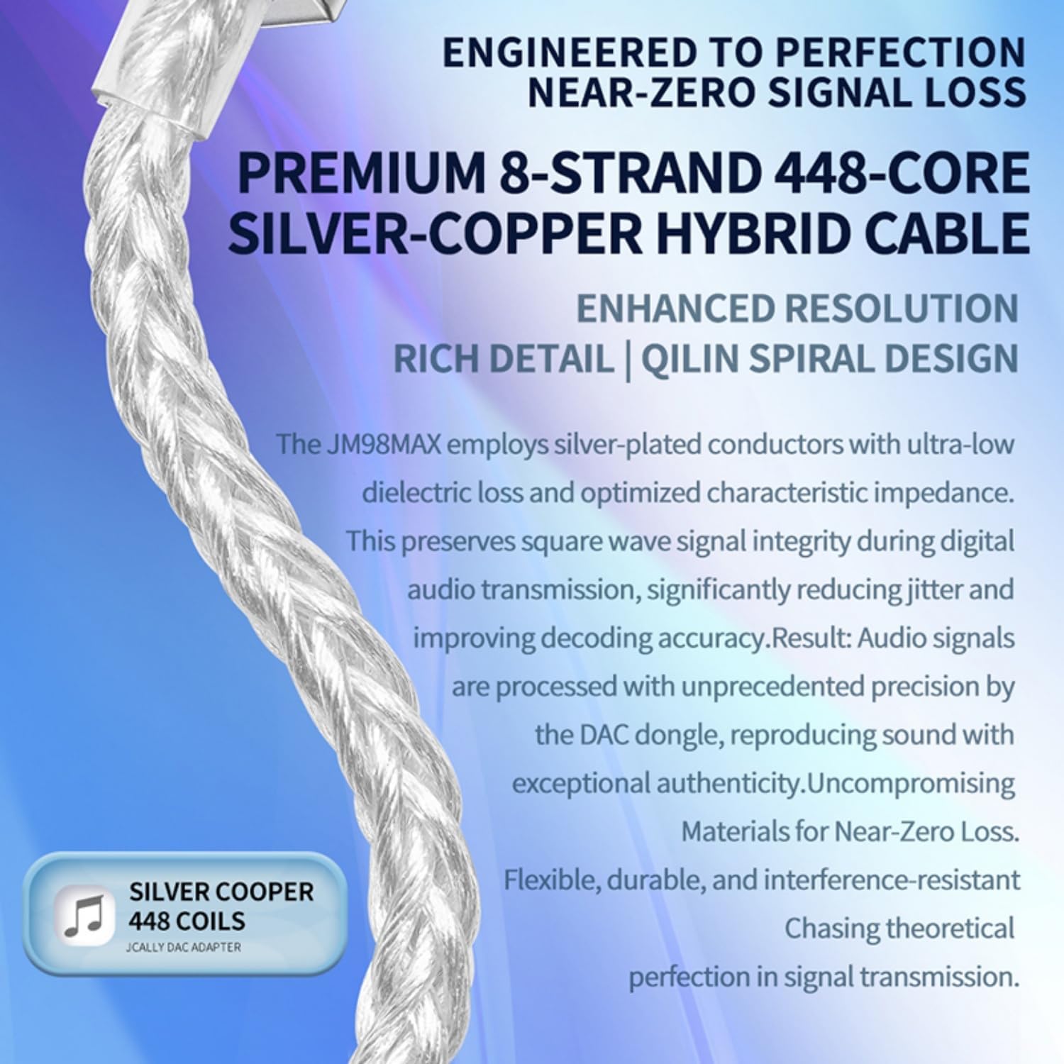 PRODUCT NAME:JM98MAX amplifier MAIN CHIP : CIRRUS LOGIC CS43198 OPAMP CHIP: SGM8262 PCM RATE:32bits/384KHz DSD RATE: DSD256(1bits 11.2MHz) SNR:~125dB (32Q, A-wt) DR:~120dB (32Q) CROSSTALK :~- 70dB (32Q) THD-N:0.0003% (32Q) NOISE:PO~1.3uV(32Q, A-wt.) OUTPUT VOLTAGE:~195mW(32Q/THD+N<1%) OUTPUT IMPEDANCE: ~0.6522 (32Q) EQ AD JUSTMENT: Balance Original Mode:Yellow Low FR Enhanced Mode:Cyan High FR Enhanced Mode: Pink SAMPLING FORMAT INDICATOR: Standby -- Red PCM -- Green DSD -- Blue FUNCTION SUPPORT: Support music, game. live streaming, record,microphone. 3 grade EQ switch, UAC1.0 and 2.0 APPLICATION:Support Android/IOS type c phone and tablet,support MAC/Windows 10 above system computer; support Switch, PS5 Windows7 system computer ( need to switch to UAC1.0) WIRE MATERIAL: 8 core silver cooper 448 coils, spiral design SHELL MATERIAL: Aluminum alloy five-axis CNC curved surface precision engraving, tempered glass CNC craft COLOUR:matte silver DIMENSION : 110±10mm NET WEIGHT:8.8g±1g GROSS WEIGHT:48g±5g