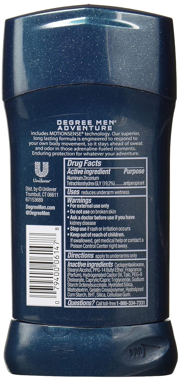 DetailsNow includes new MOTIONSENSE technology. This breakthrough formula is engineered to respond to your own body movement, so it stays ahead of sweat and odor in those adrenaline-fueled moments. Enduring protection for whatever your adventure. DirectionsApply to underarms onlyWARNINGS:For external use onlyDo not use on broken skinAsk a doctor before use if you have kidney disease.Stop use if rash or irritation occurs.Keep out of reach of childrenIf swallowed, get medical help or contact a Poison Control Center right away.