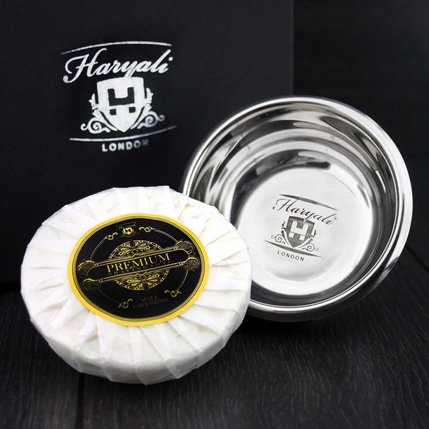 BLACK BADGER HAIR::Particularly suitable for wet shavers who like to treat themselves to a light facial massage. The brush head is made by machine, while the material is slightly firmer than other badger hair qualities- and varies in colour from brownish- grey to black.Double Edge Safety (Pure Black Handle): 3 Piece Safety Razor The razor uses a 3-piece design using some of the finest chrome plating on the market today. The 3-piece design is marginally more involved compared with a butterfly or duo-clip head when replacing a blade, but this is a small sacrifice to make as you will be rewarded with high-quality materials and a very comfortable and easy to use tool;STAINLESS STEEL BOWL A quality Stainless Steel Shaving Bowl that is perfect for creating a great lather. The smart looking bowl is perfect for any modern bathroom. + LEATHER POUCH FOR RAZOR & SOAP. Set comes in A Designer box