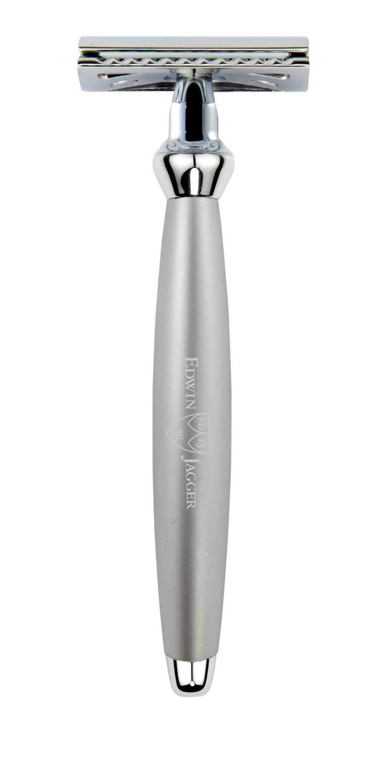 Part of the Bulbous range, this contemporary shaped razor is handmade in Sheffield, England using solid turned blue polyester handle, finished with triple chrome plated collar and end cap. The Edwin Jagger DE head is highly reputed for balance and shave quality. Used with a standard DE razor blade, and quality shaving cream or soap, this razor will produce a close and accurate shave often compared to that of a straight razor. Overall length 115mm. Beautifully balanced; a pleasure to use. Suitable for any standard DE replacement blades